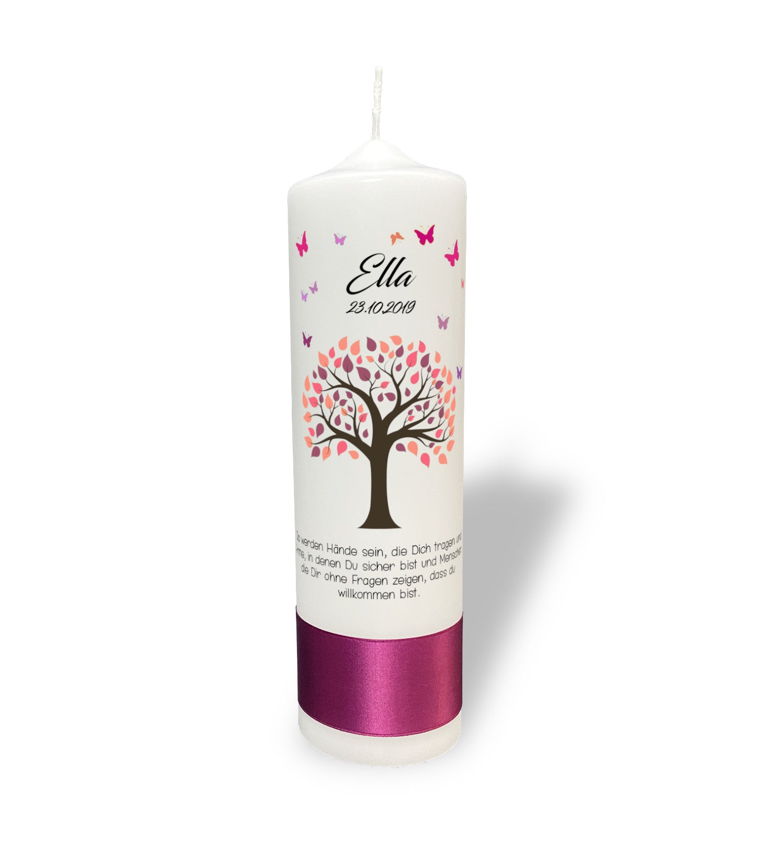 Motiv: Entdecken Sie unsere zarte Lebensbaum-Taufkerze, kunstvoll geschmückt mit rosa Blättern und eleganten Schmetterlingen. Diese Symbole der Reinheit und des Neuanfangs bringen eine Atmosphäre der Sanftheit und des Wachstums in die Taufzeremonie. Ein liebevolles Andenken, das die zarte Liebe und die flüchtige Schönheit des Lebens widerspiegelt.