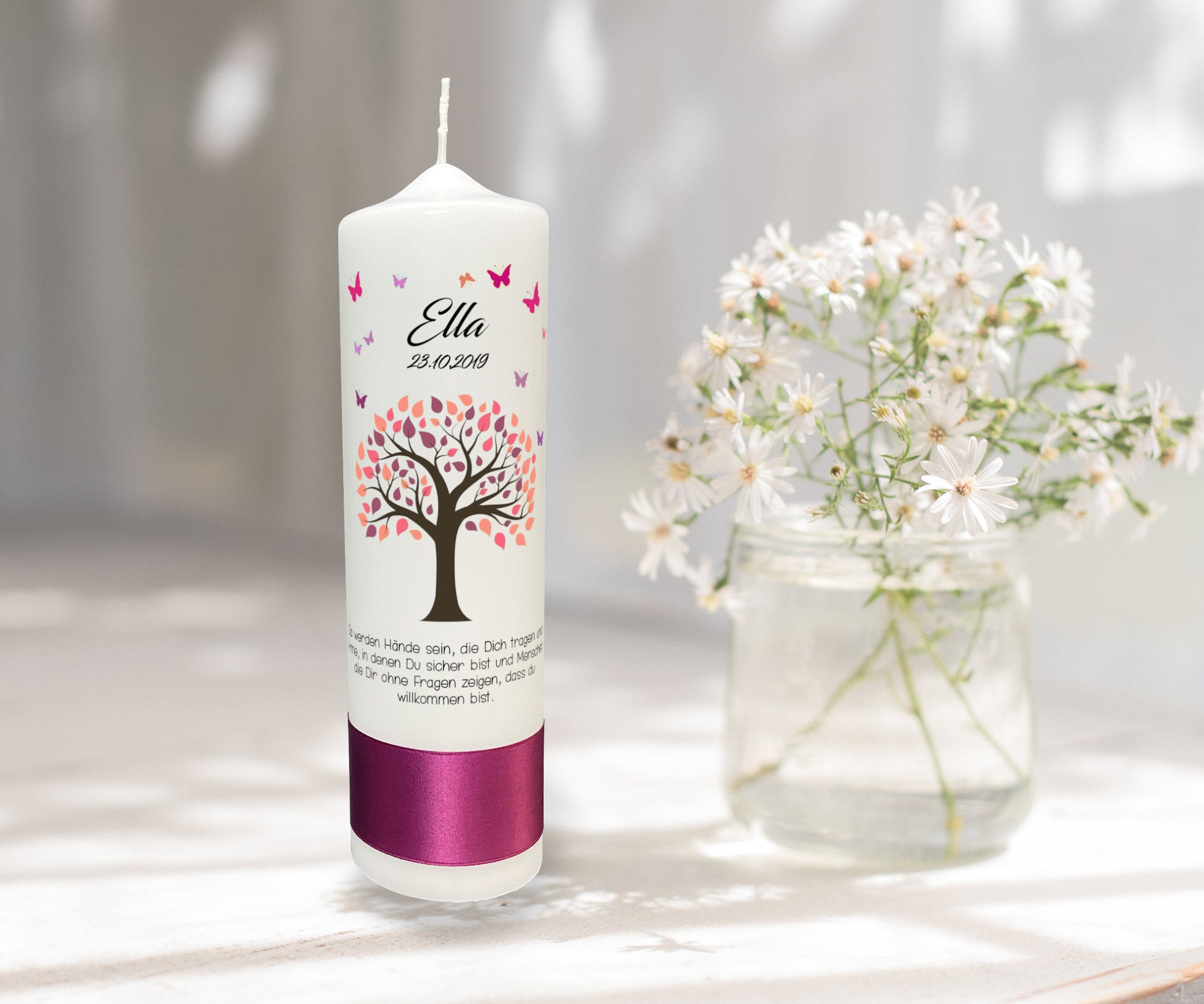 Taufkerze: Zartes Erblühen – Lebensbaum mit rosa Blättern und Schmetterlingen