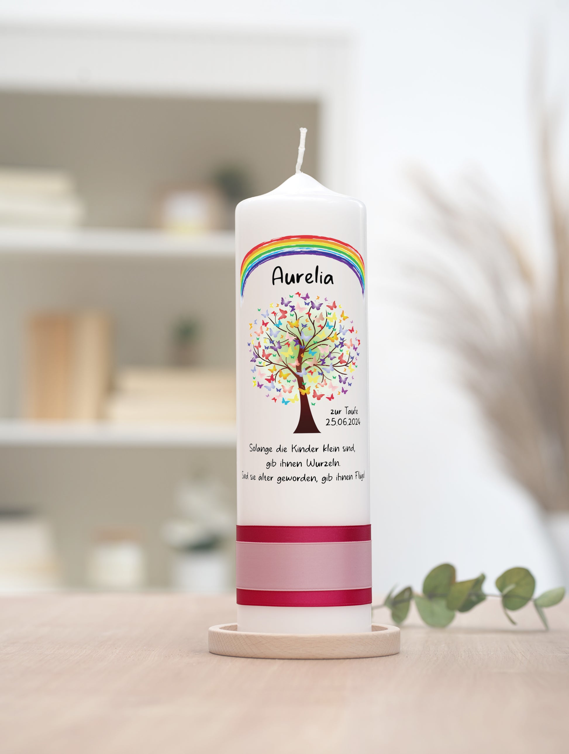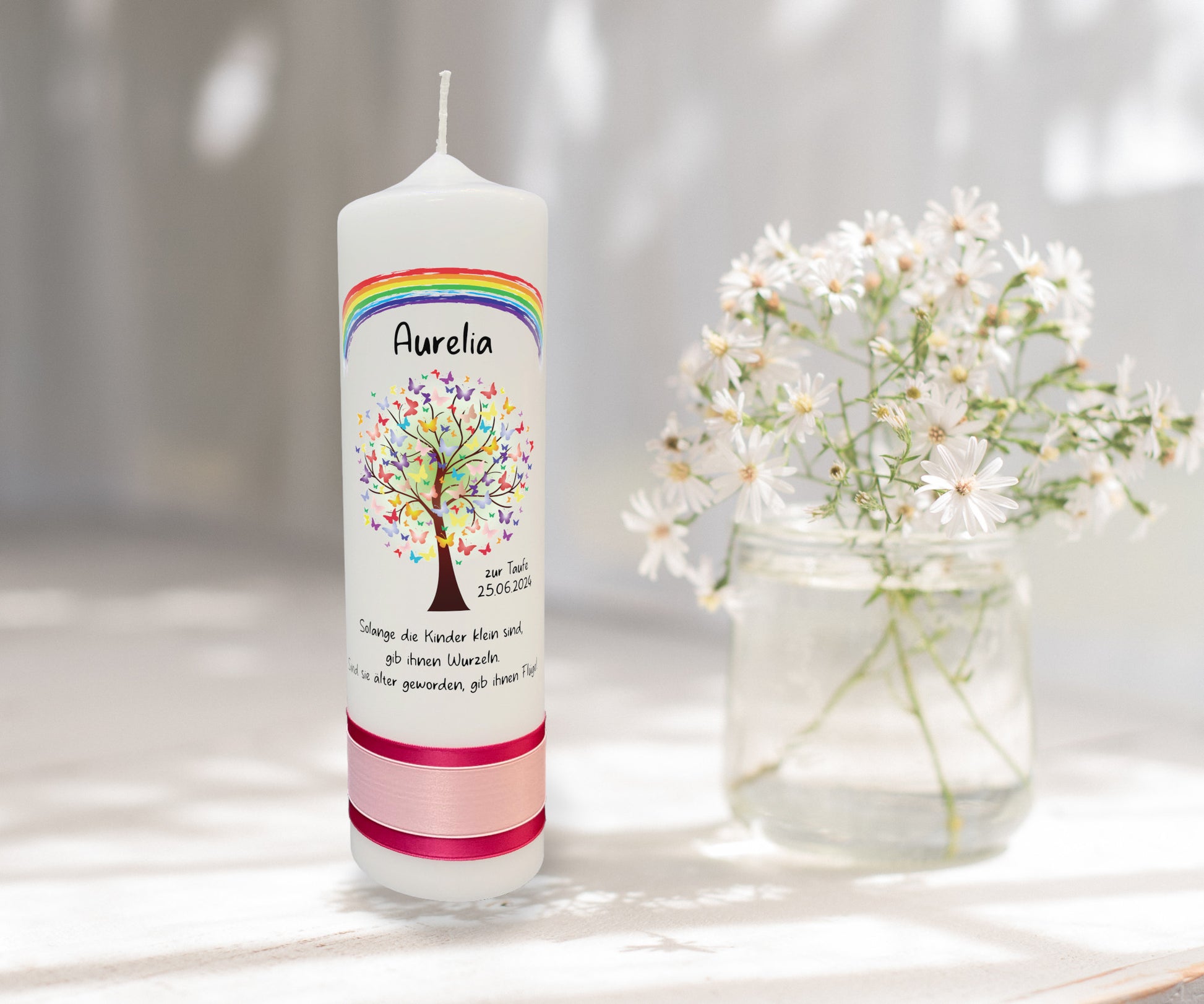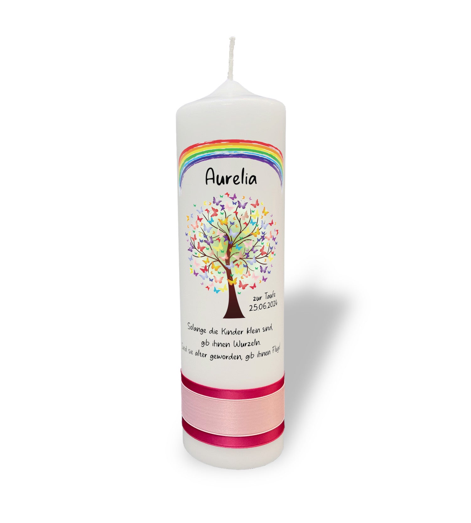 Motiv: Diese Taufkerze vereint die Kraft des Lebensbaums mit der Schönheit von Schmetterlingen und der Vielfalt eines Regenbogens. Sie symbolisiert Wachstum, Freiheit und die farbenfrohe Vielfalt des Lebens. Ein leuchtendes Zeichen der Hoffnung und des Neuanfangs, das die Taufzeremonie mit Freude und Farbe bereichert und ein lebenslanges Andenken an diesen besonderen Tag darstellt.