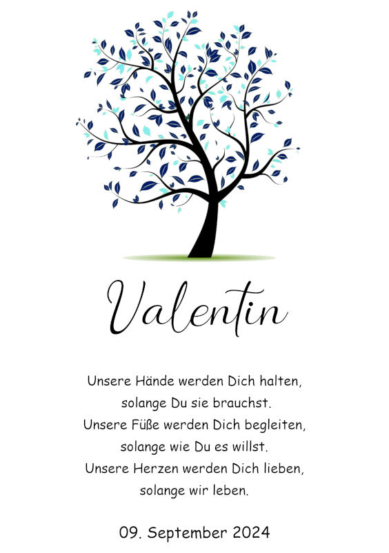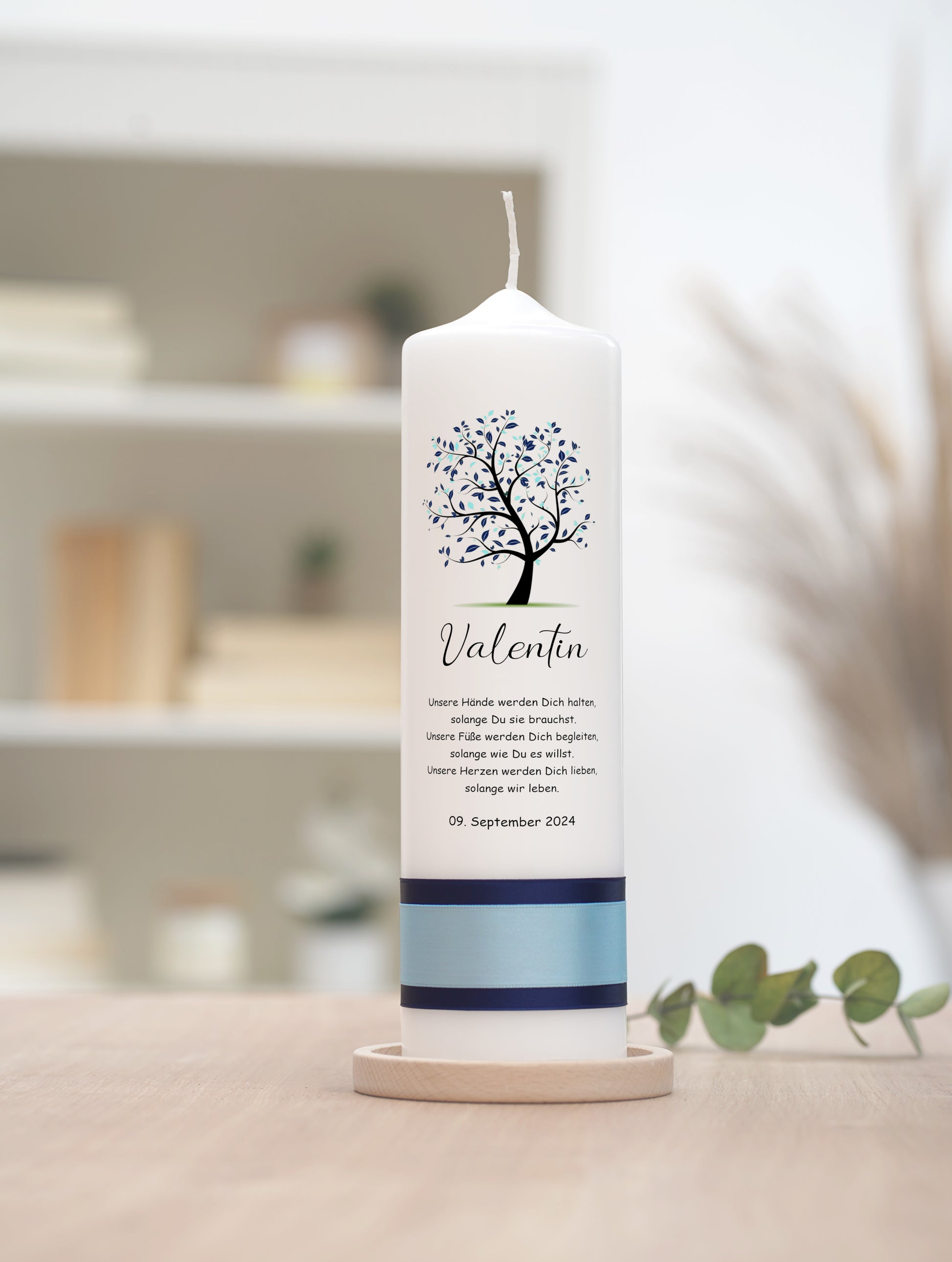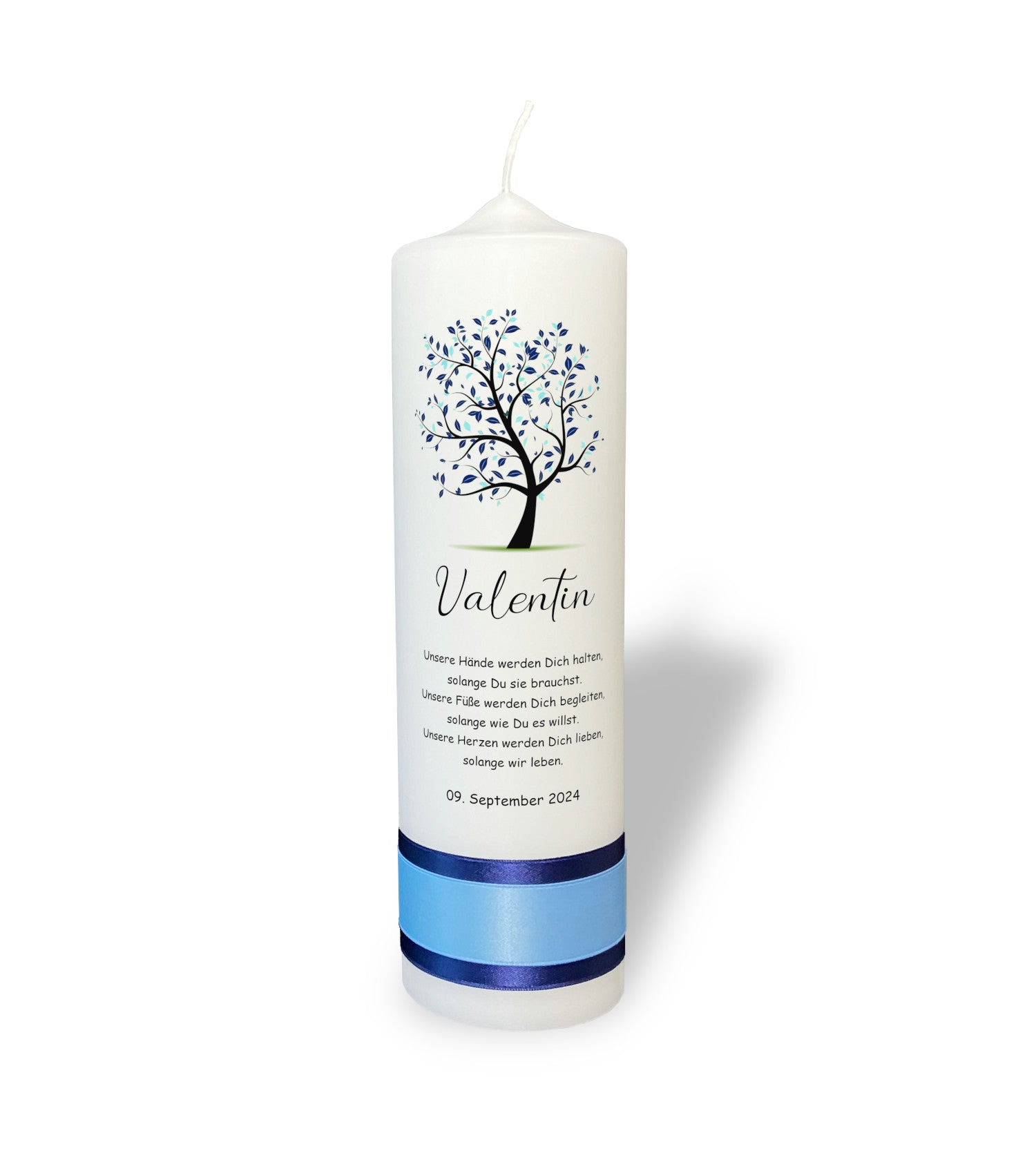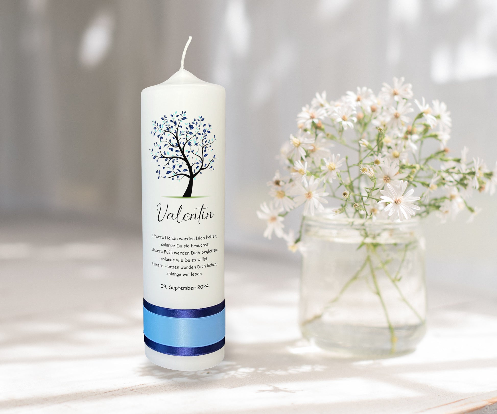 Motiv: Erleben Sie die Taufe mit unserer besonderen Kerze, die den Lebensbaum mit blauen Blättern zeigt. Diese Farbgebung symbolisiert Ruhe, Weisheit und tiefen Glauben, während der Baum selbst für Stärke und lebenslanges Wachstum steht. Ein Symbol der Hoffnung und des Friedens, das Licht in die Zeremonie bringt und als leuchtendes Andenken an diesen heiligen Tag dient.