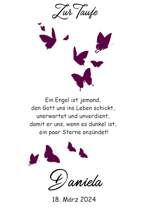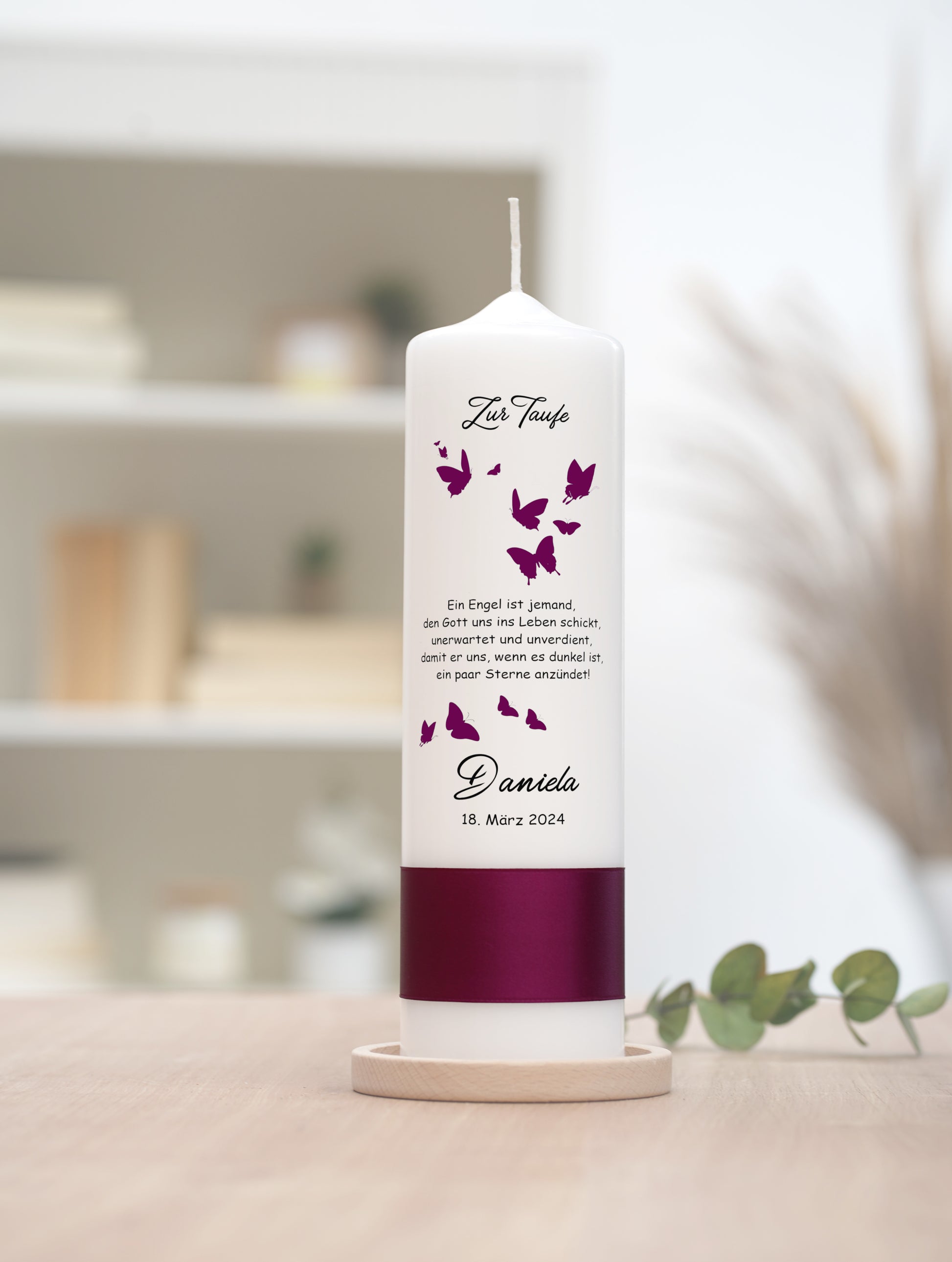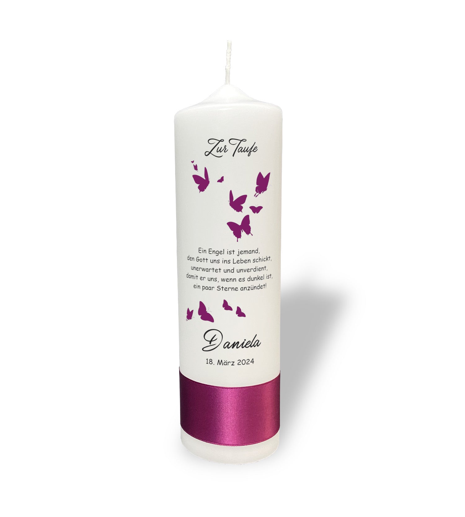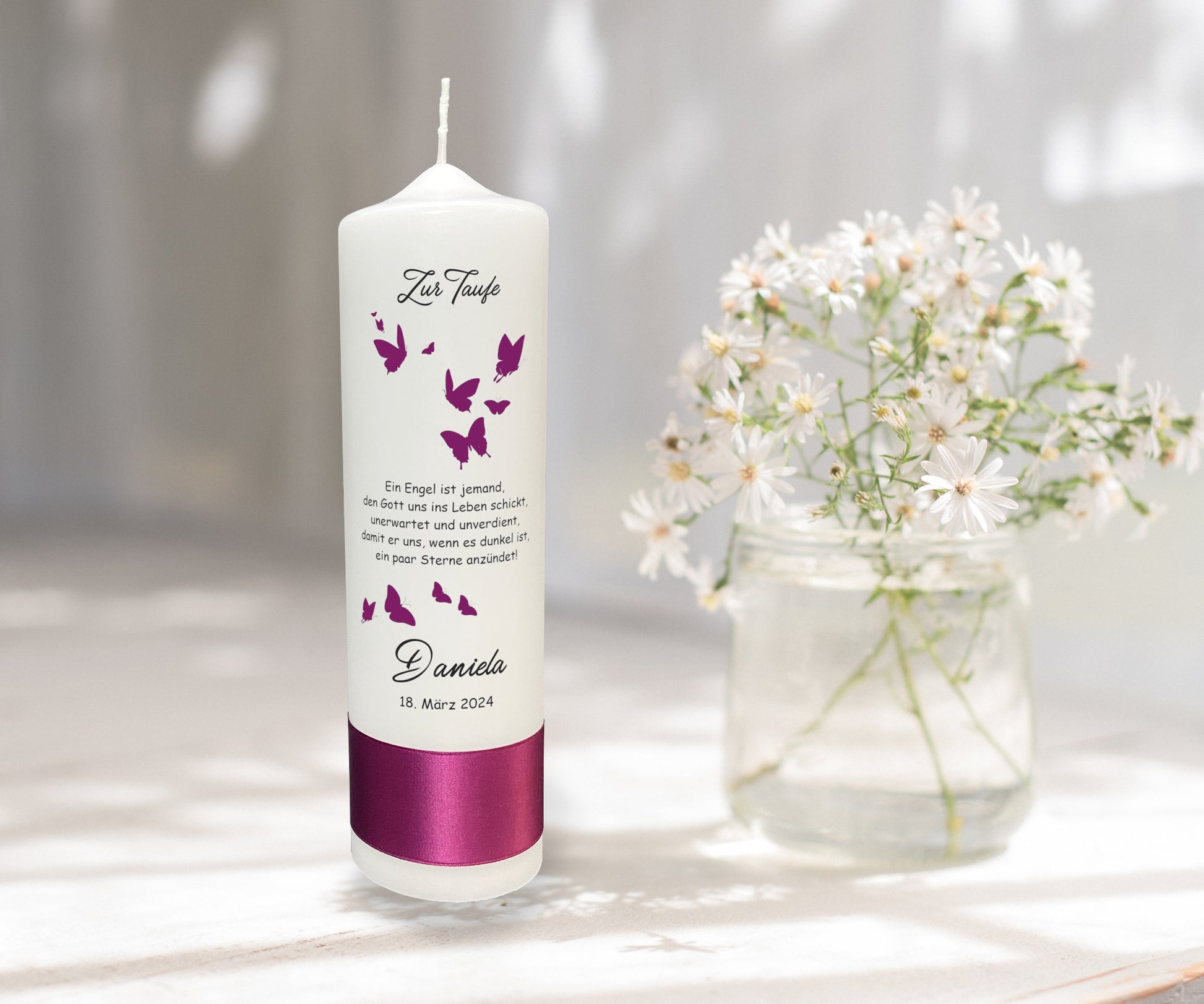 Motiv: Diese Taufkerze, geschmückt mit dem zarten Motiv von Kardinalschmetterlingen, symbolisiert die Schönheit der Transformation und des Neubeginns. Die leuchtenden Farben der Schmetterlinge stehen für Lebensfreude und Hoffnung, während ihr sanfter Flug den Schutz und die Führung auf dem Lebensweg Ihres Kindes darstellt. Ein strahlendes Zeichen der Veränderung und des Glaubens, das die Taufzeremonie bereichert.