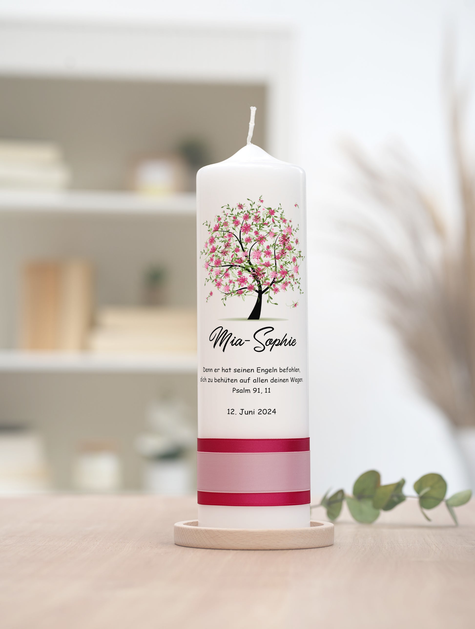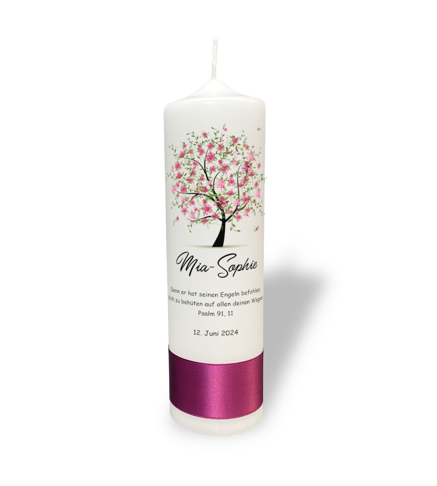 Motiv: Verziert mit einem Baum in voller rosa Blüte, verkörpert diese Kerze die Schönheit und Reinheit eines Neubeginns. Die zarten Blumen symbolisieren Wachstum und die Freude des Lebens, eine bezaubernde Begleitung für besondere Lebensereignisse.