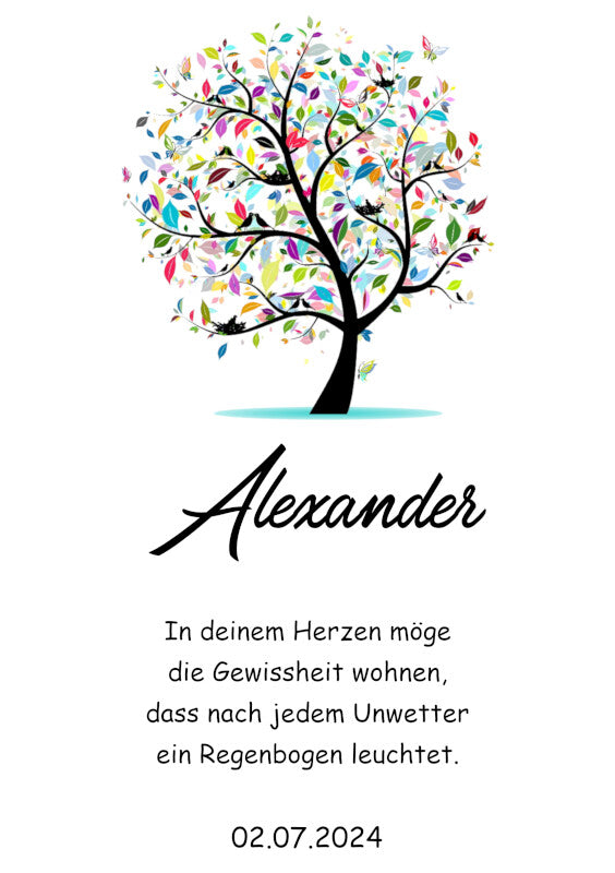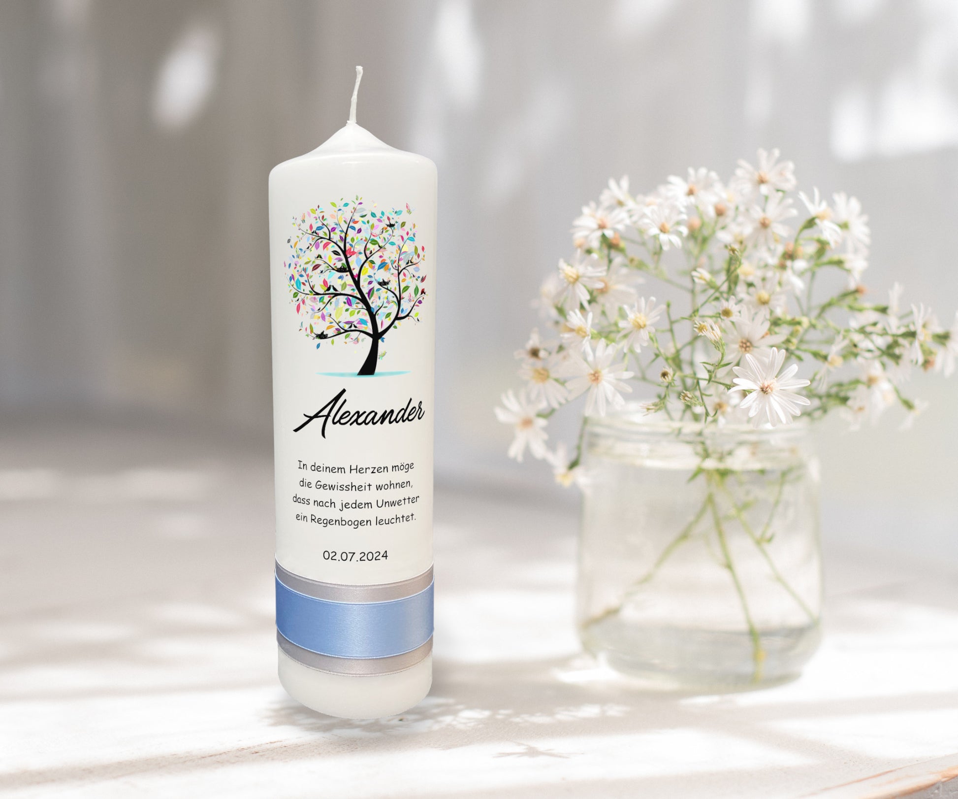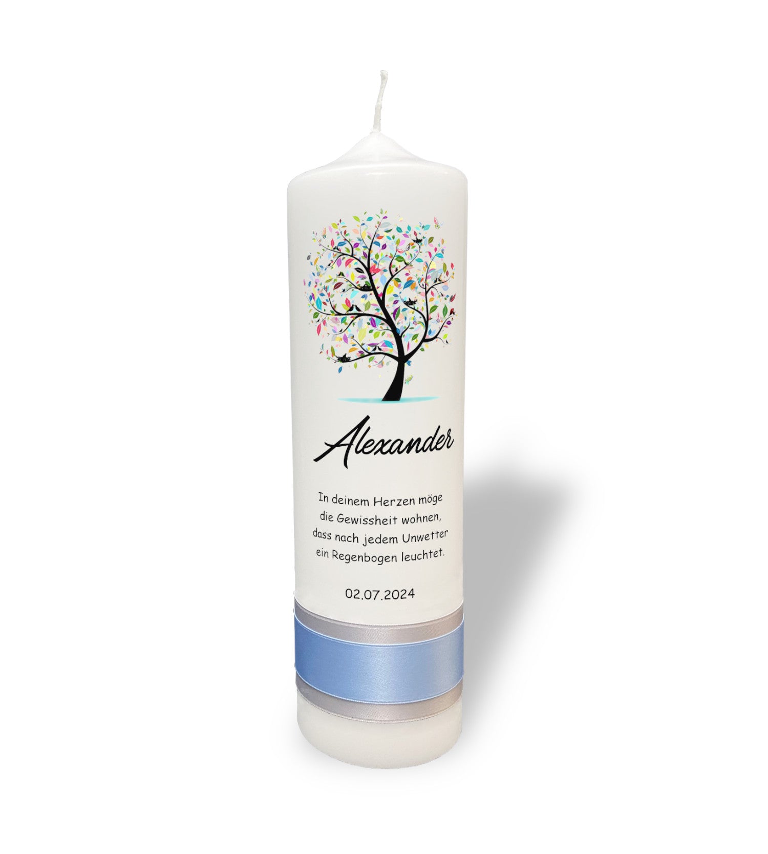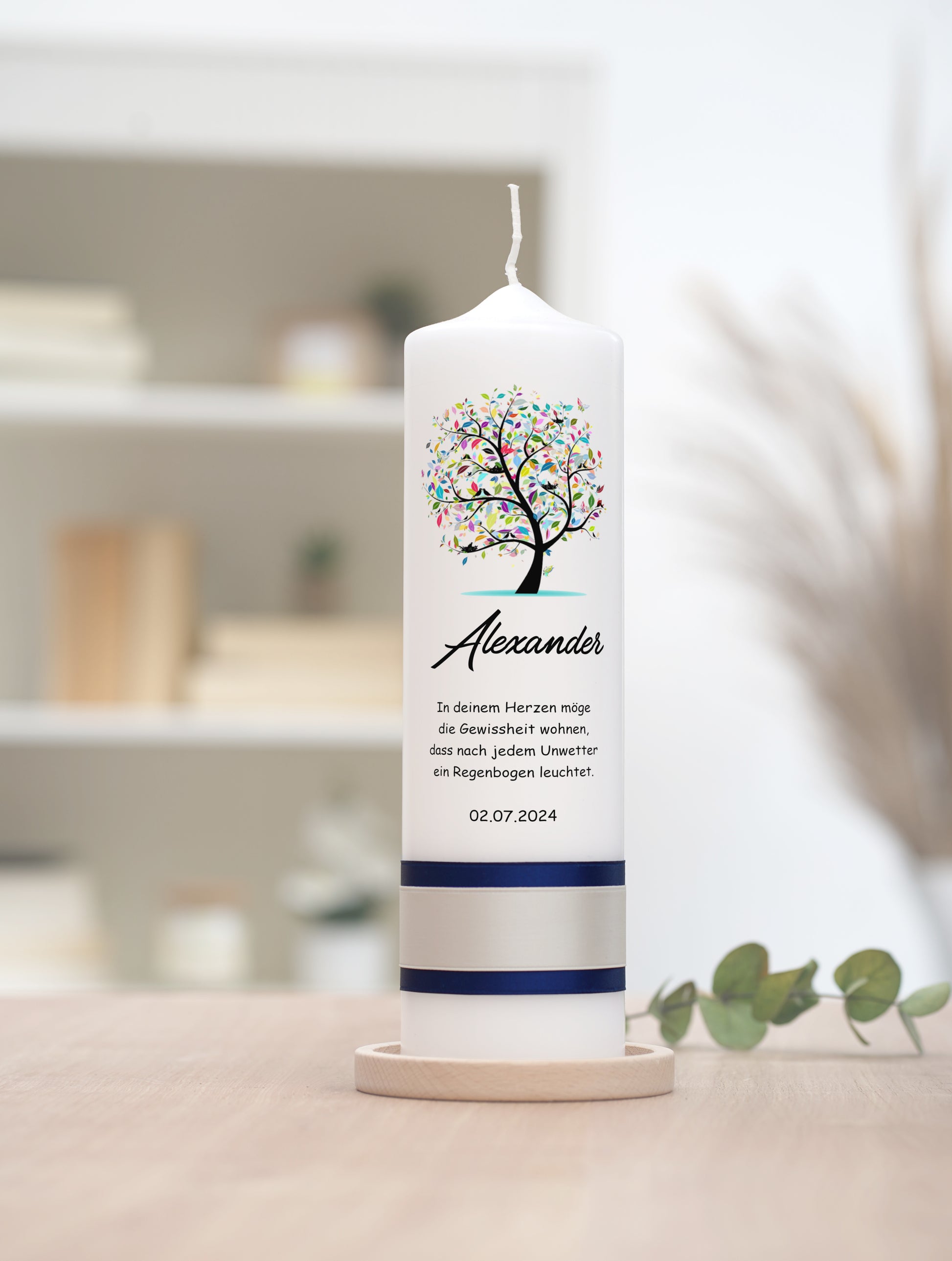 Motiv: Die Kerze präsentiert einen Baum, dessen Blätter aus einem Kaleidoskop von Farben bestehen, welches die Vielfalt und Schönheit des Lebens widerspiegelt. Dieses farbenfrohe Design ist ein leuchtendes Symbol für Freude und Hoffnung, das jeden besonderen Anlass bereichert.