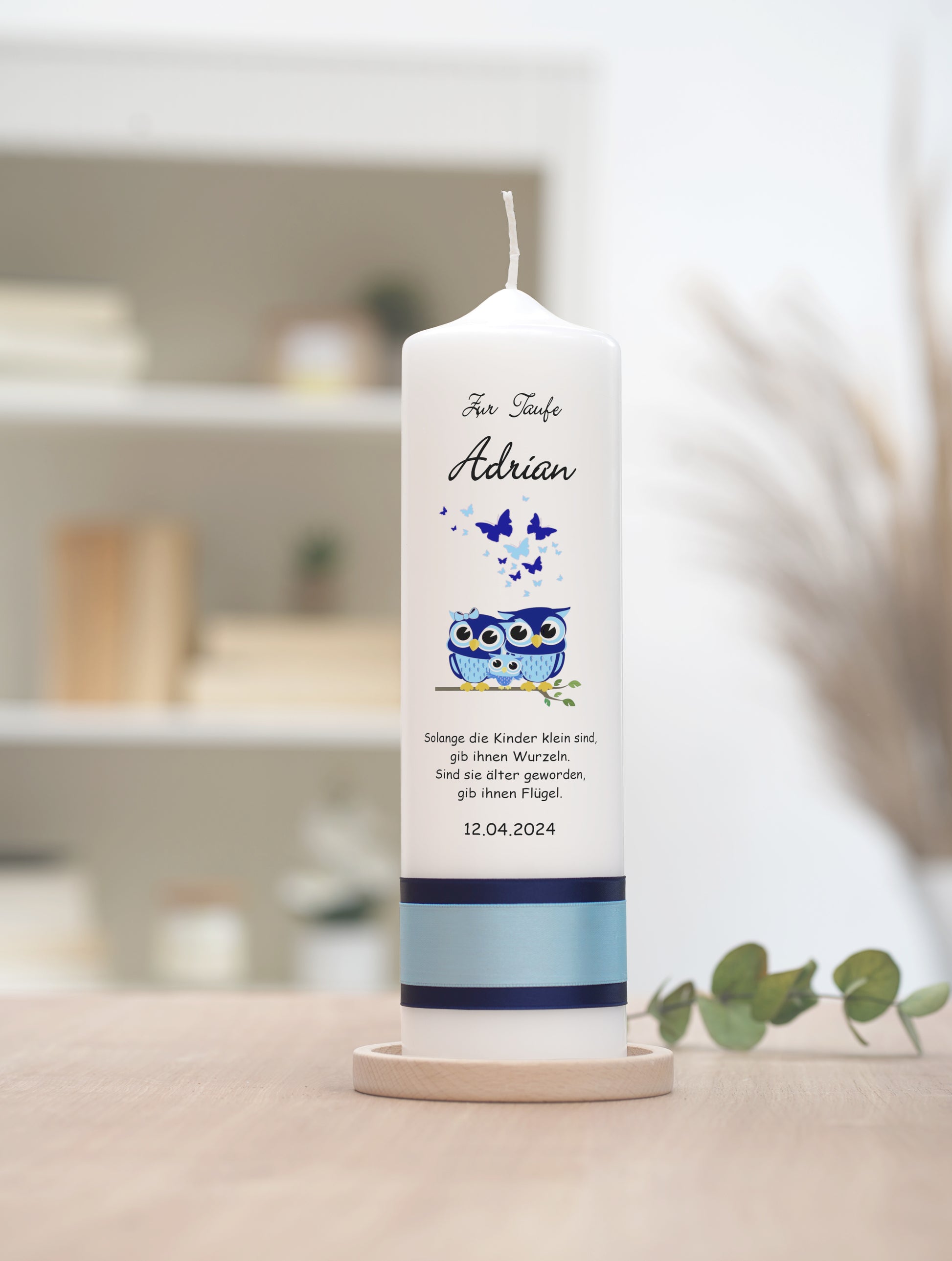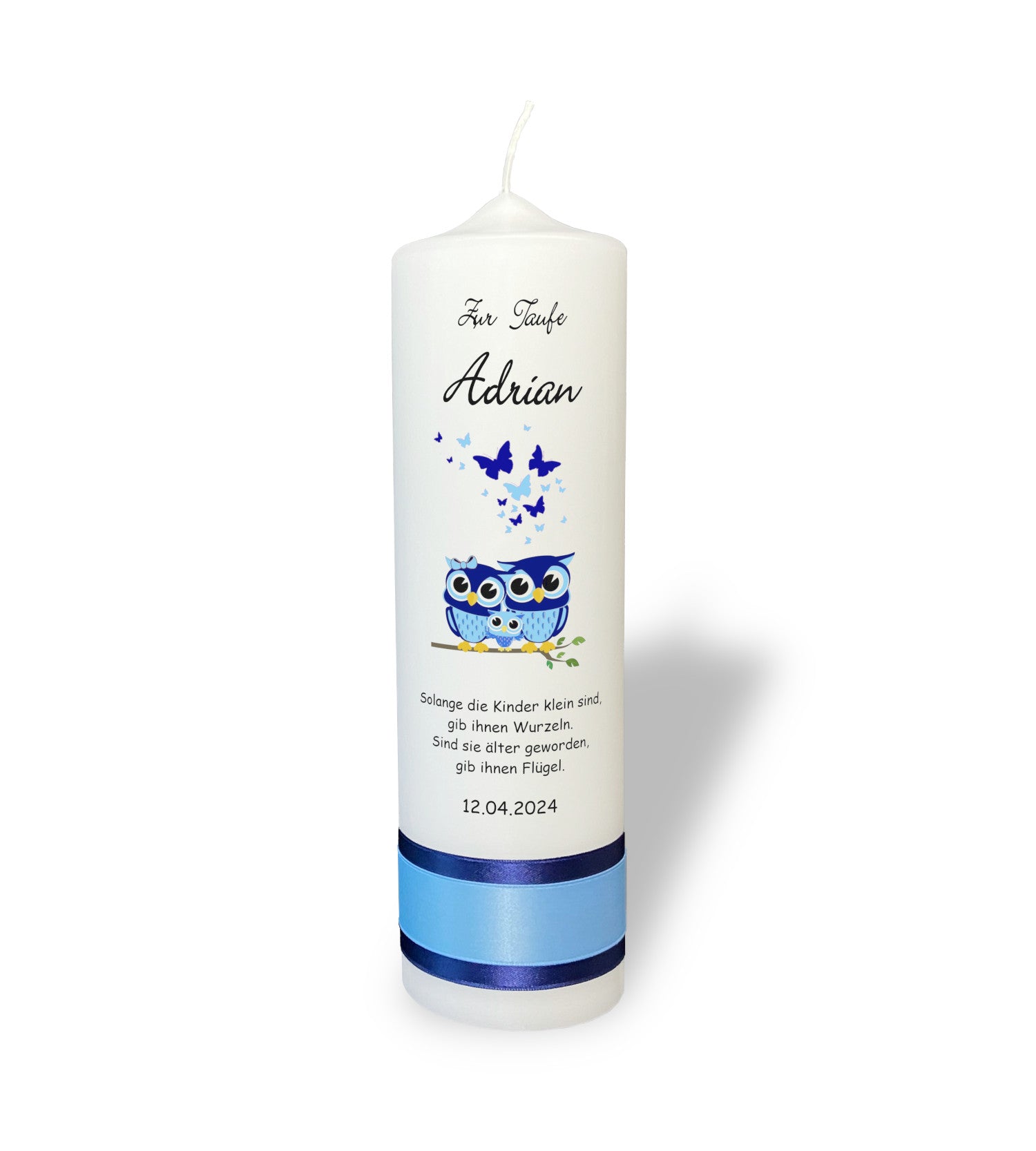 Motiv: Diese Taufkerze präsentiert stolz eine Familie von blauen Eulen, begleitet von einem Schwarm zarter Schmetterlinge. Ein Bild, das Wurzeln und Flügel zugleich symbolisiert – Stabilität und Freiheit für den Weg des Lebens.