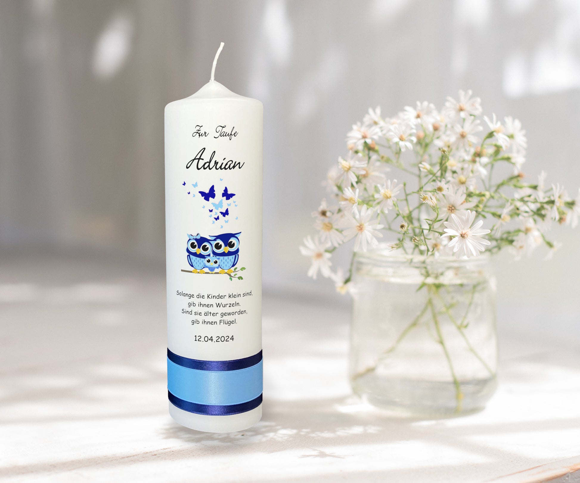 Taufkerze: Eulenweisheit und Schmetterlingsflug