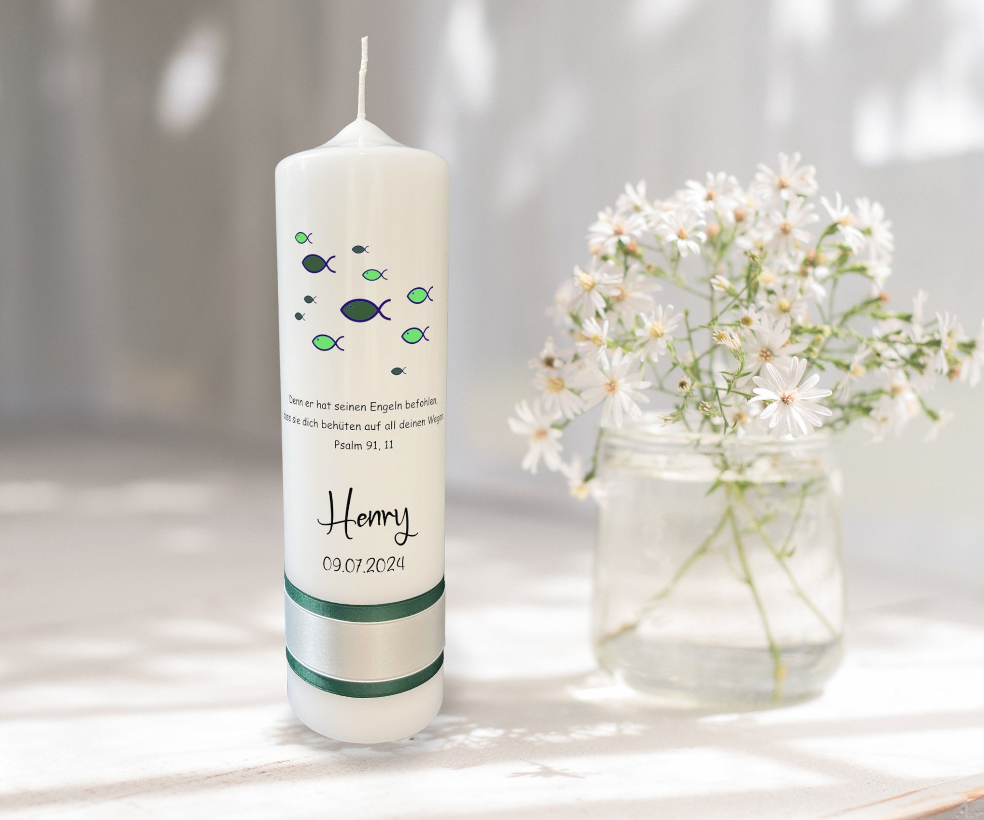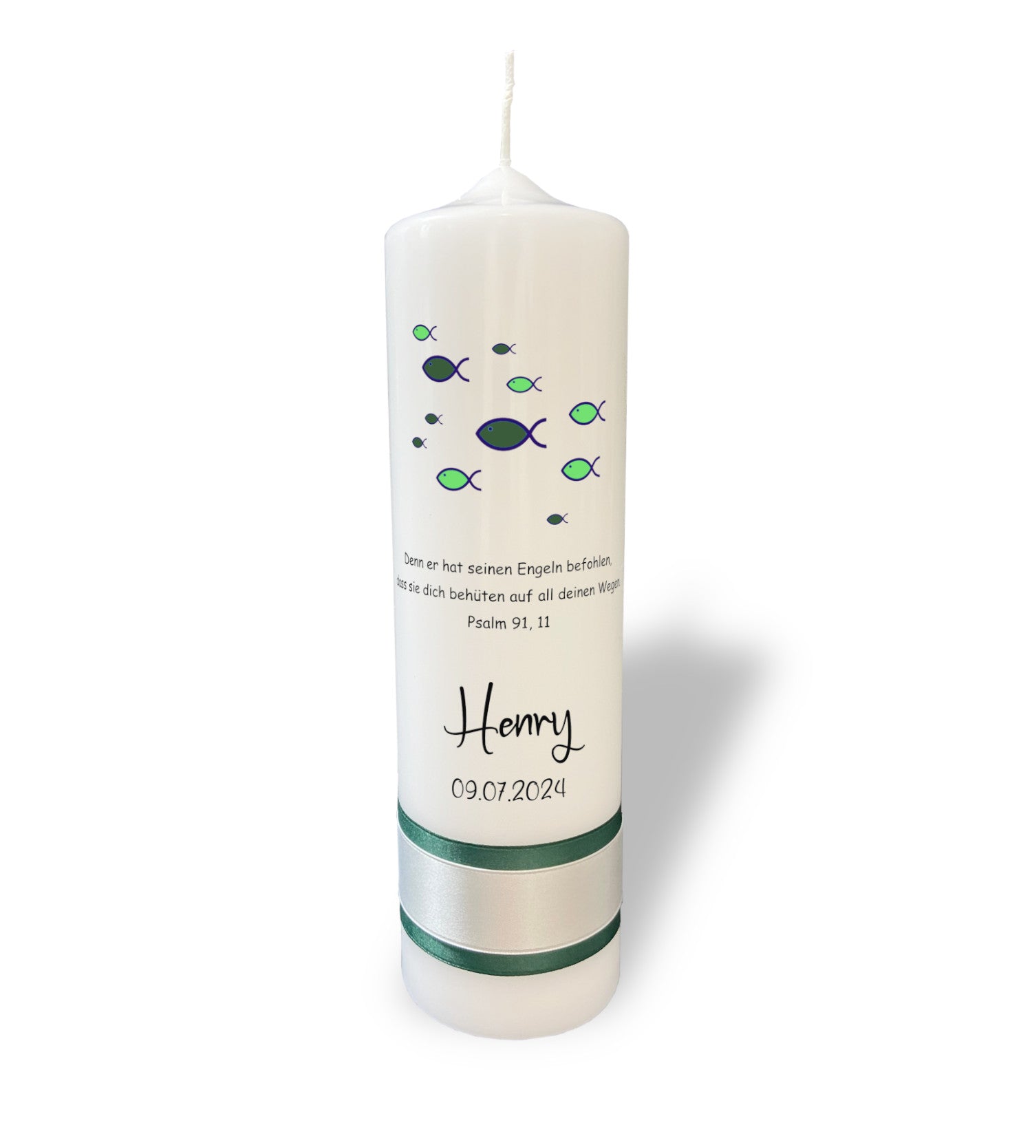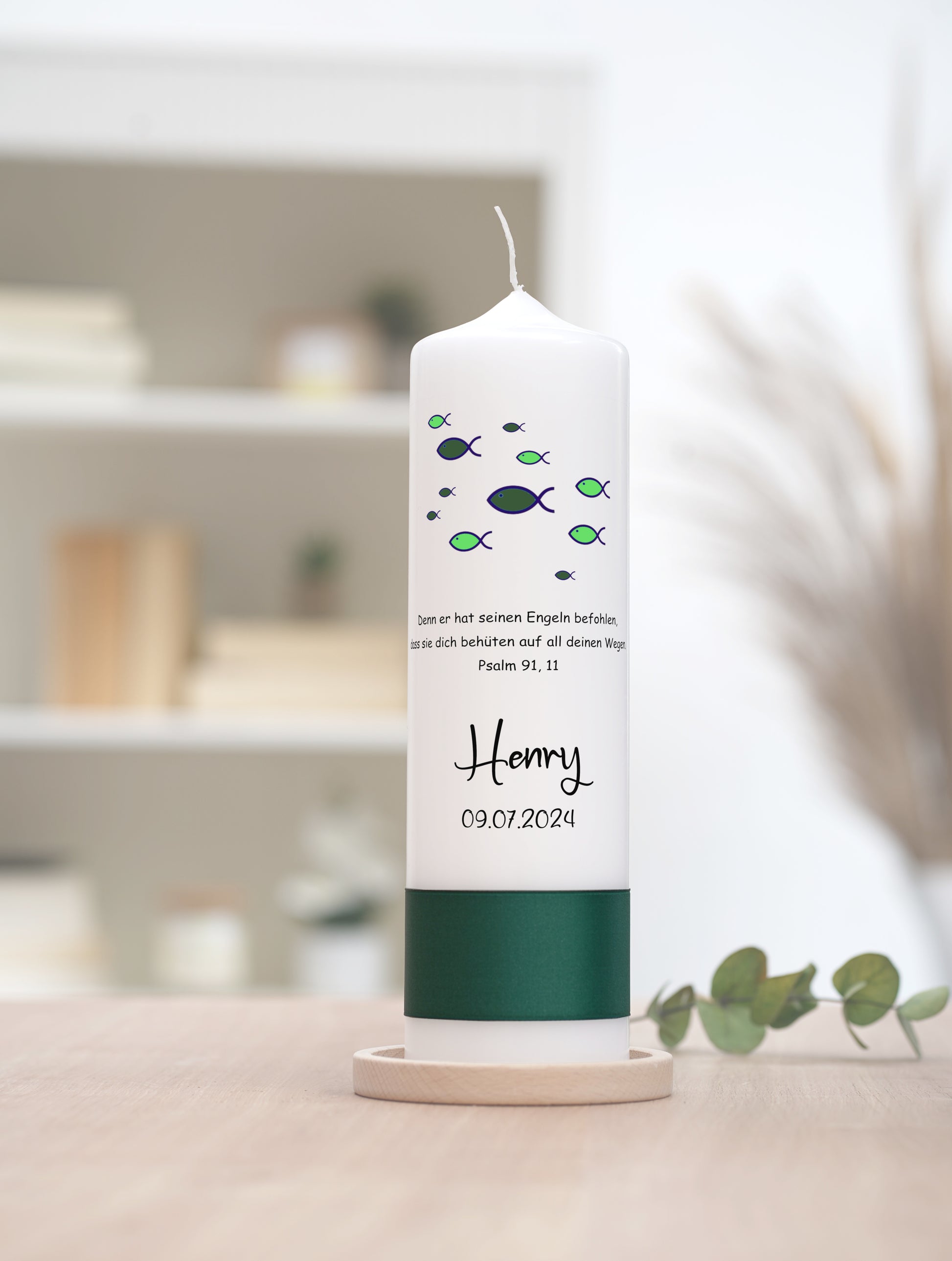 Motiv: Diese Taufkerze ist mit einer fröhlichen Schar von Fischen in beruhigenden Grüntönen dekoriert und strahlt eine friedliche Atmosphäre aus. Perfekt für eine Taufe, symbolisiert sie die Führung und den Schutz auf den Wegen des Lebens.