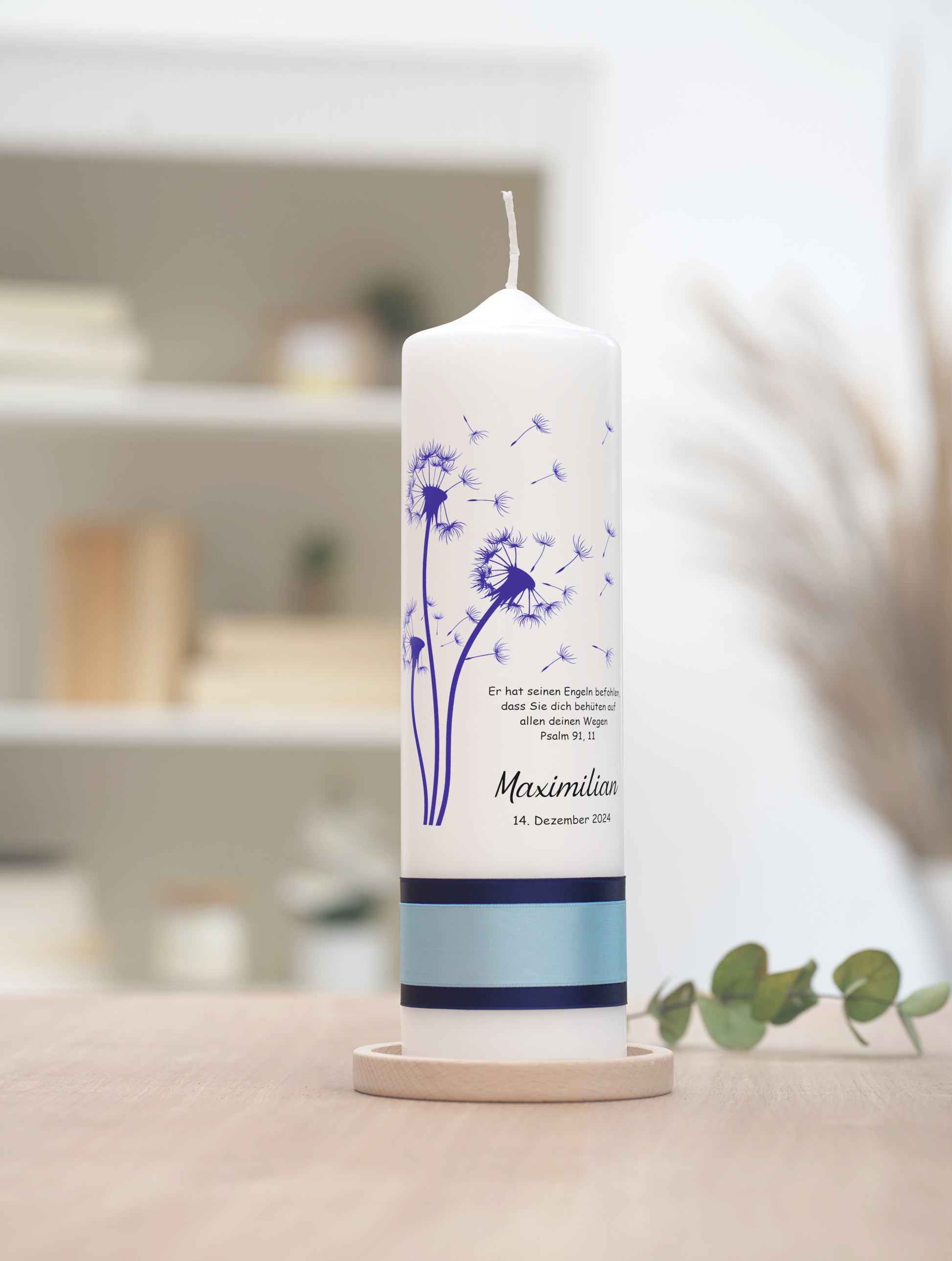 Motiv: Diese stilvolle Taufkerze, verziert mit dem zarten Motiv einer Pusteblume, deren Samen sich im Wind verbreiten, steht symbolisch für Hoffnungen und Wünsche, die in die Welt hinausgetragen werden. Sie ist ein Zeichen der Freiheit und des Glaubens, dass jeder Weg unter göttlichem Schutz steht.