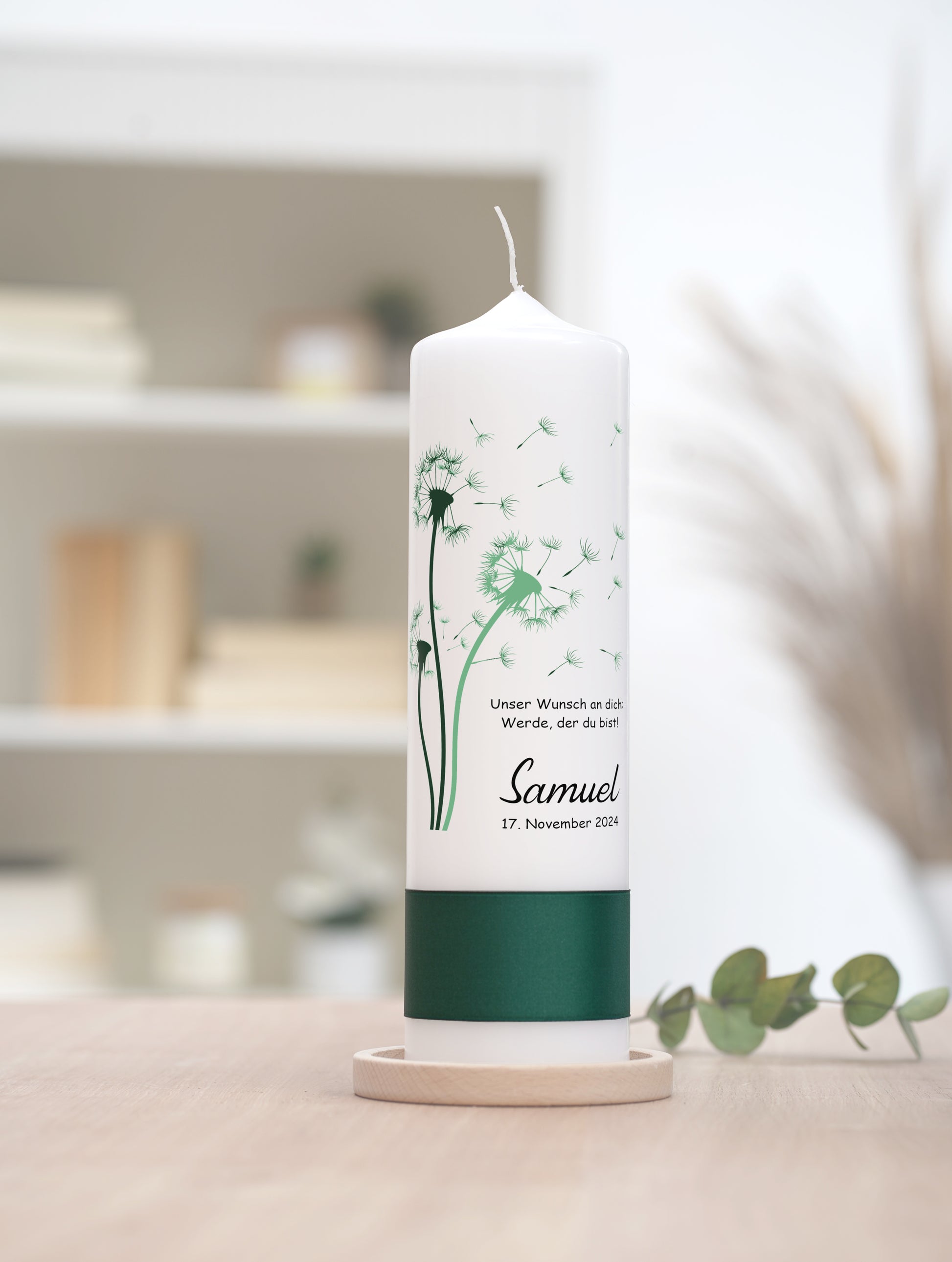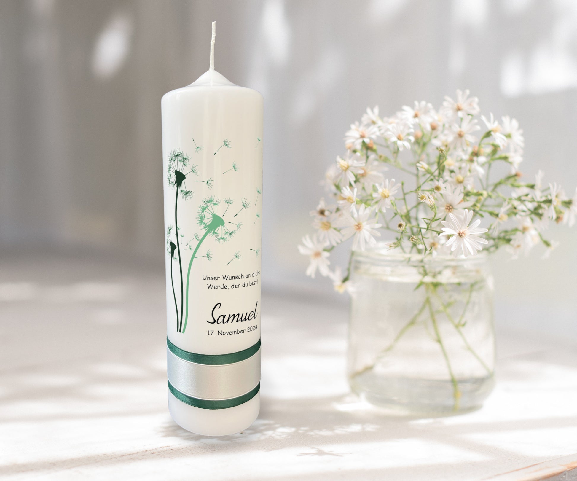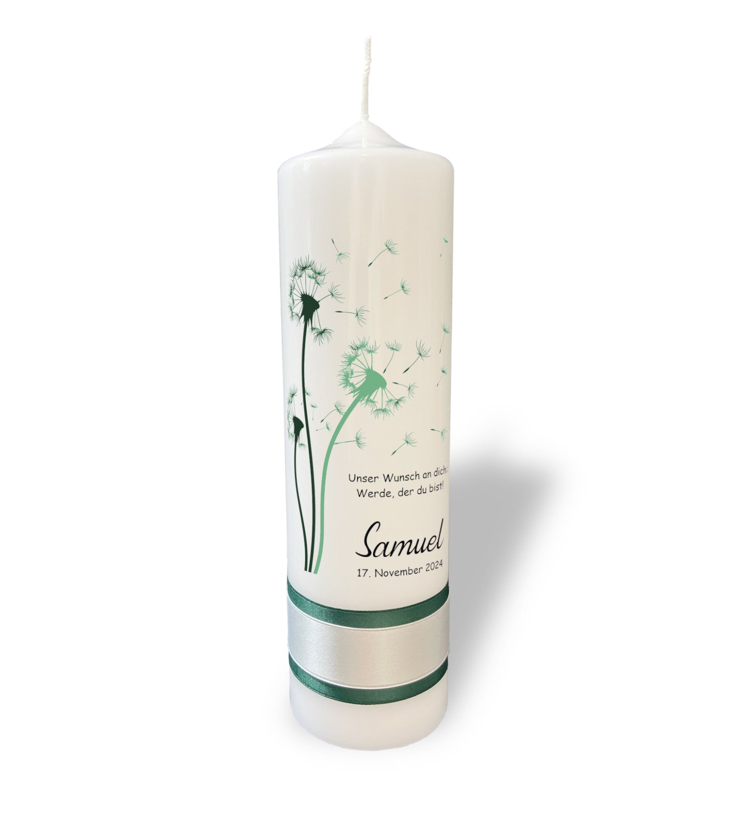 Motiv: Umhülle den Tauftag mit einer Botschaft der Hoffnung und des Neuanfangs. Diese Taufkerze, gekrönt von einer sanften Pusteblume, symbolisiert das stille Wachsen und die behutsamen Wünsche, die wir für den neuen Lebensweg aussenden. Ein Hauch von Grün, der die Ruhe der Natur widerspiegelt, begleitet diesen feierlichen Anlass.