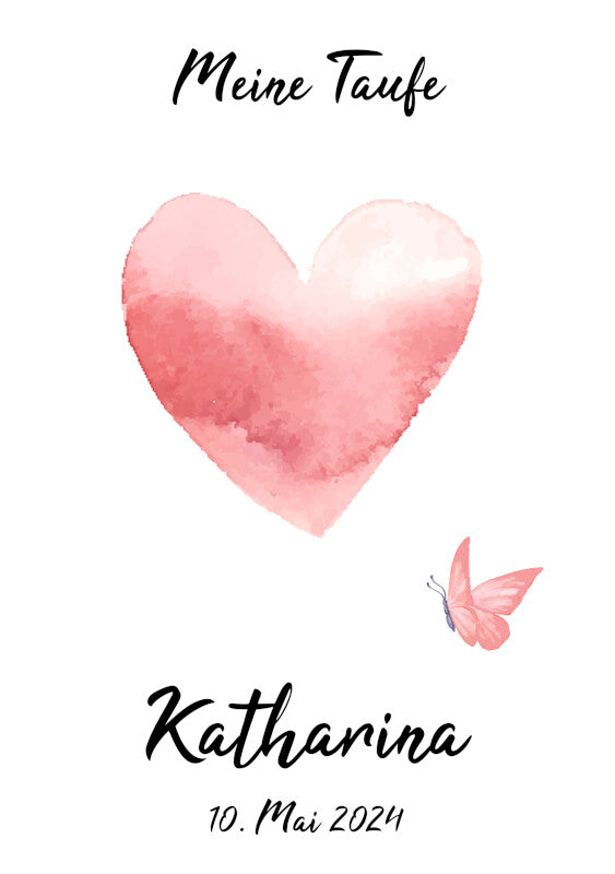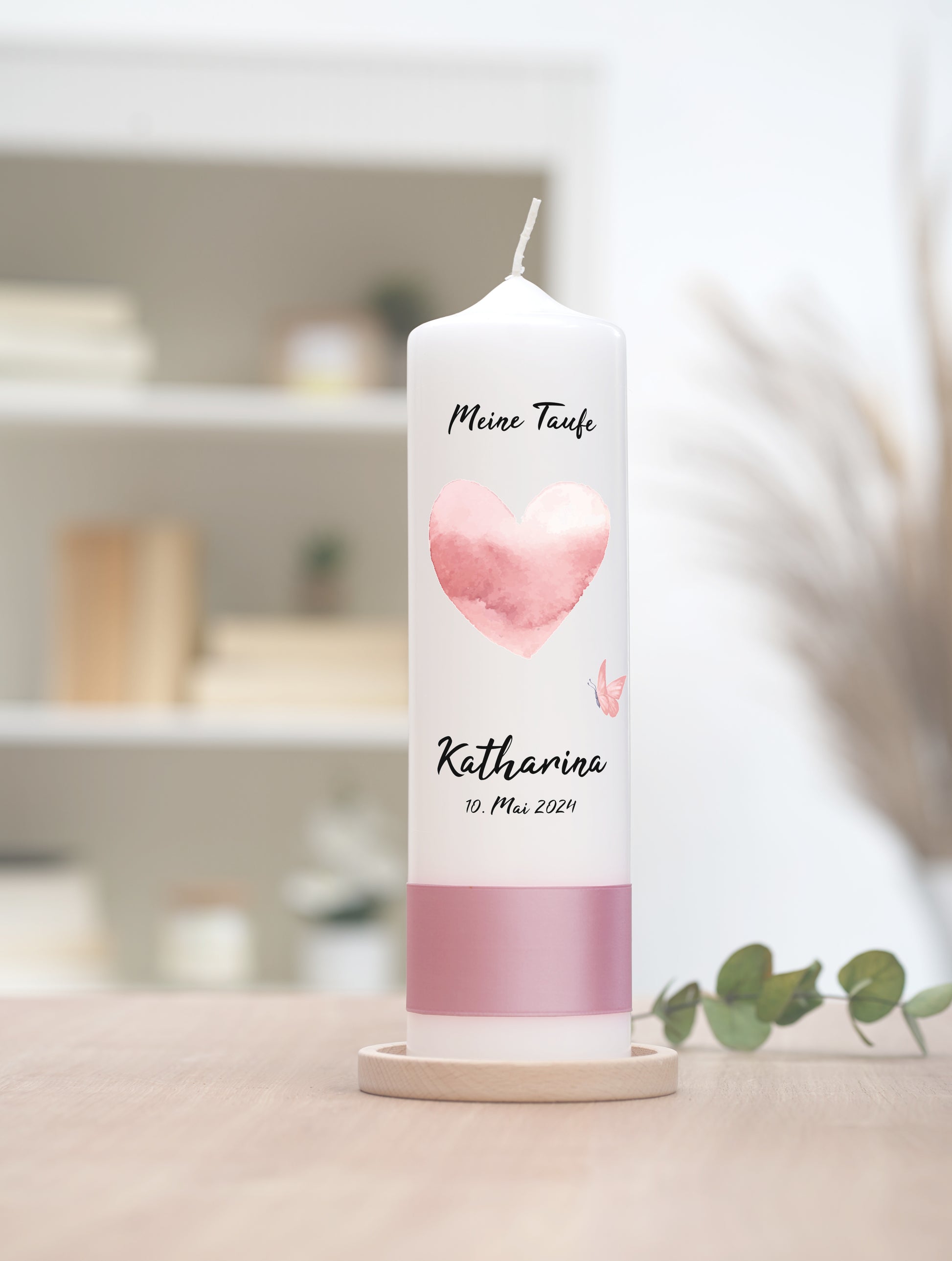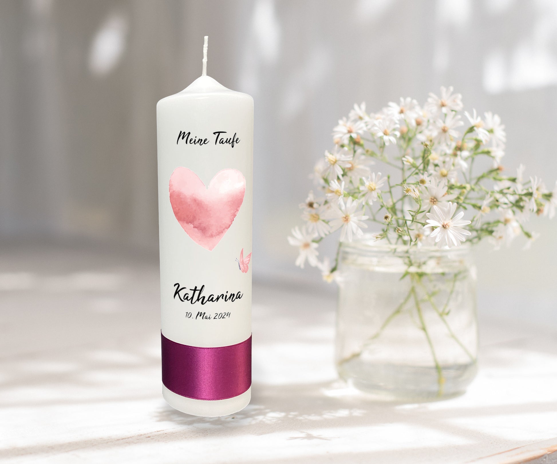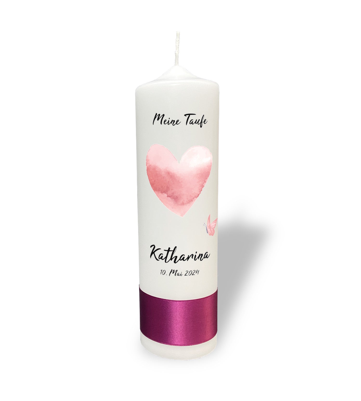 Motiv: Entzünde einen Funken der Freude mit dieser liebevoll gestalteten Taufkerze, die Herzlichkeit und Sanftheit in ihrem Design vereint. Ein zartes Herz, umspielt von einem feinen Schmetterling, symbolisiert die unbeschwerte Liebe und Freude, die das Leben des Täuflings erfüllen soll. Diese Kerze wird nicht nur während der Taufzeremonie ein Licht der Hoffnung und des Glücks sein, sondern auch ein lebenslanger Begleiter, der an diesen besonderen Tag erinnert.