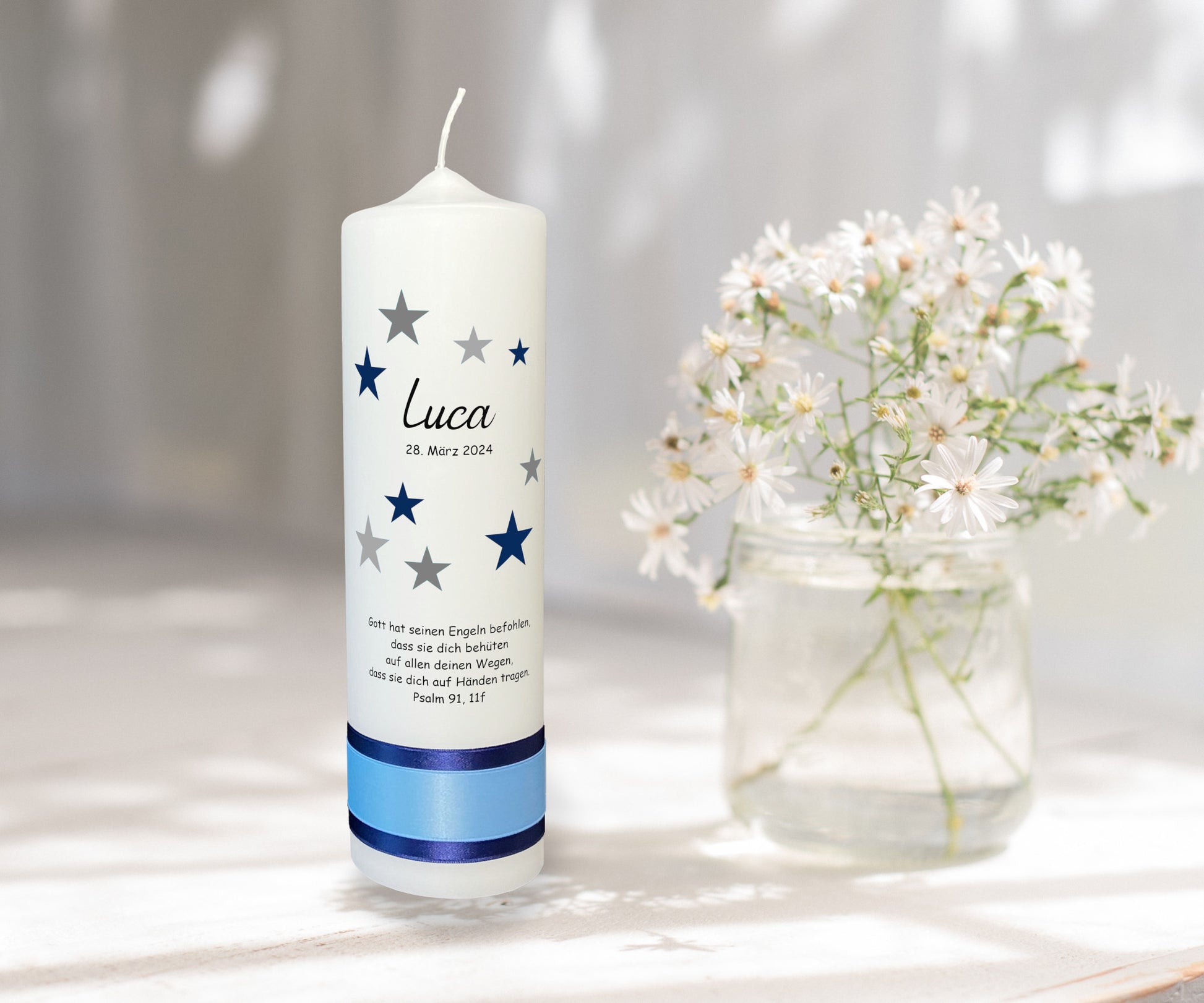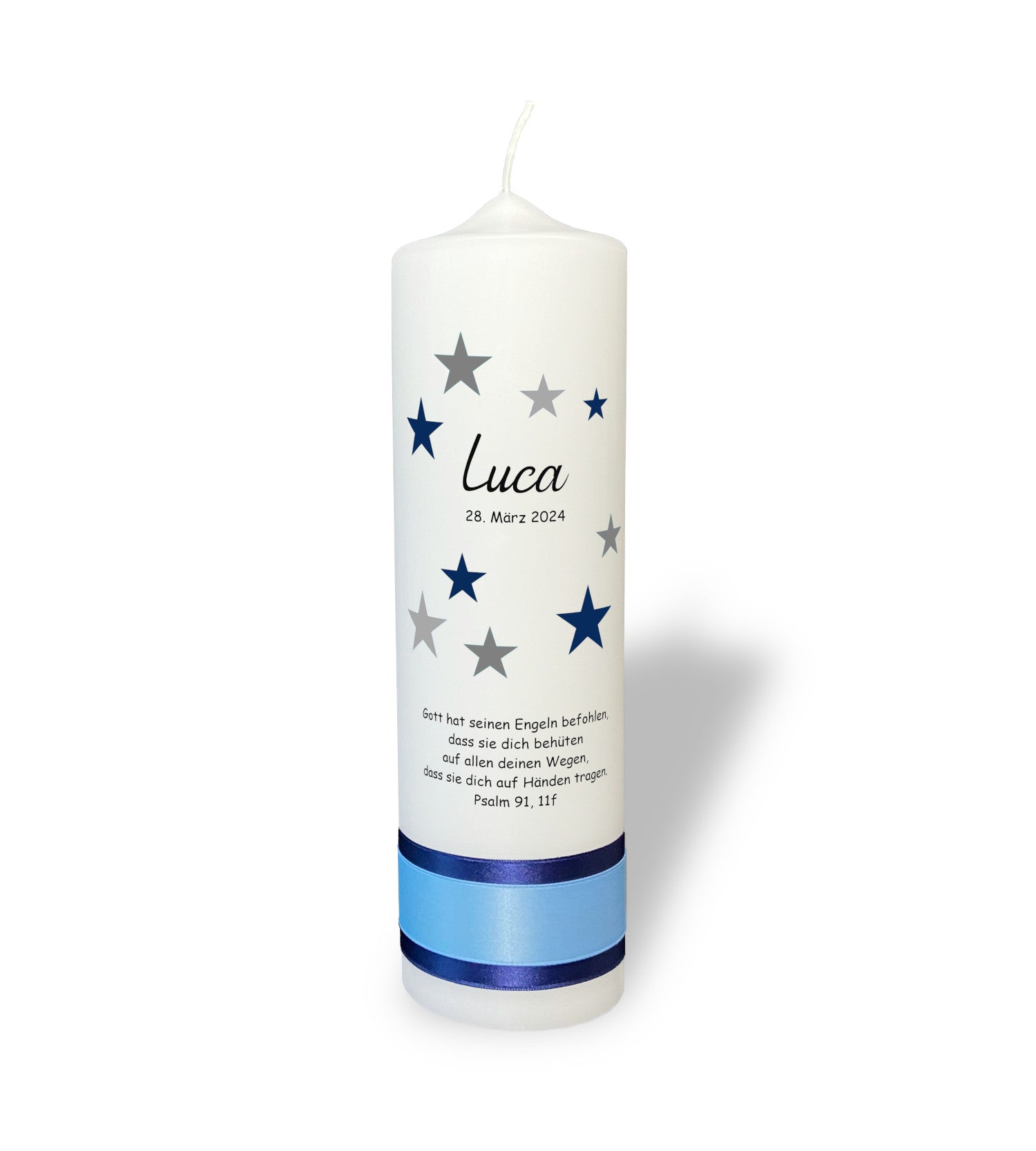 Motiv: Erleuchten Sie den besonderen Tag Ihres Kindes mit einer Kerze, die so einzigartig ist wie der Anlass selbst. Unser Himmelszauber-Design fängt die Reinheit und das Wunder der Taufe ein, indem es den Nachthimmel in einem Spiel aus sanften Grau- und tiefen Blautönen auf die Kerze bringt. Die Sterne, sorgfältig arrangiert, symbolisieren Schutz und Führung auf den Lebenswegen des Kindes. Jede Kerze wird liebevoll handgefertigt, um diesen denkwürdigen Moment für Jahre zu bewahren.