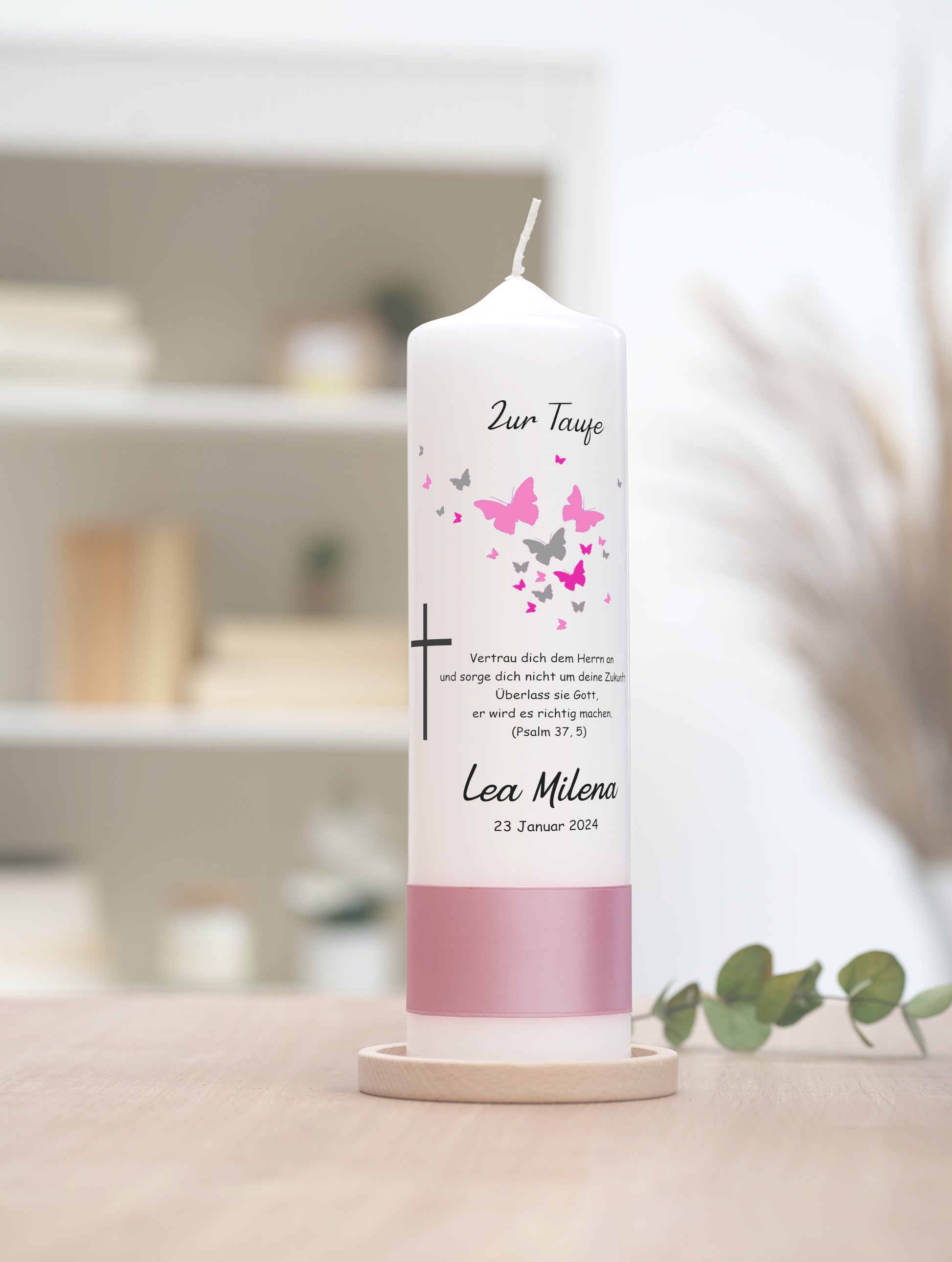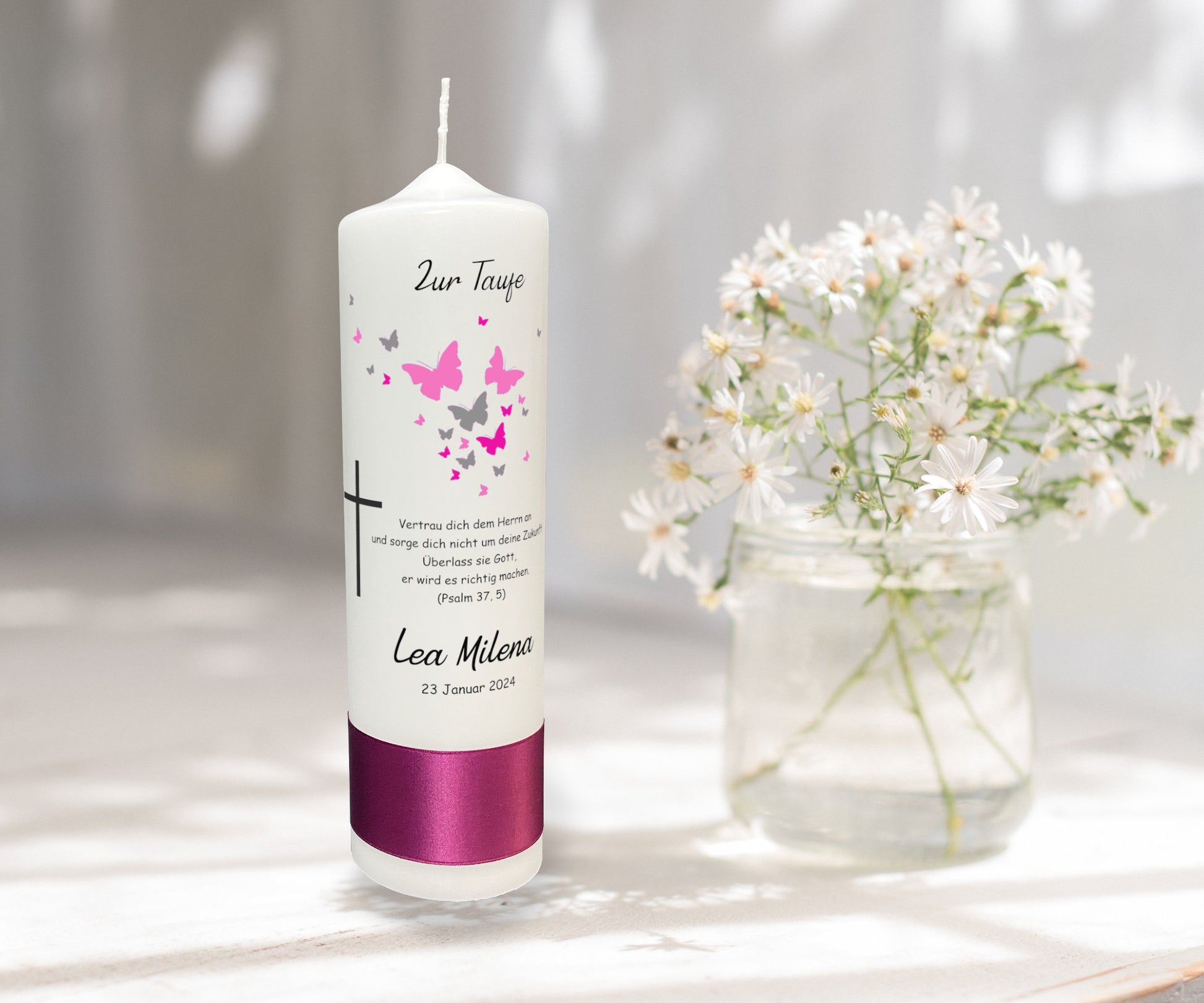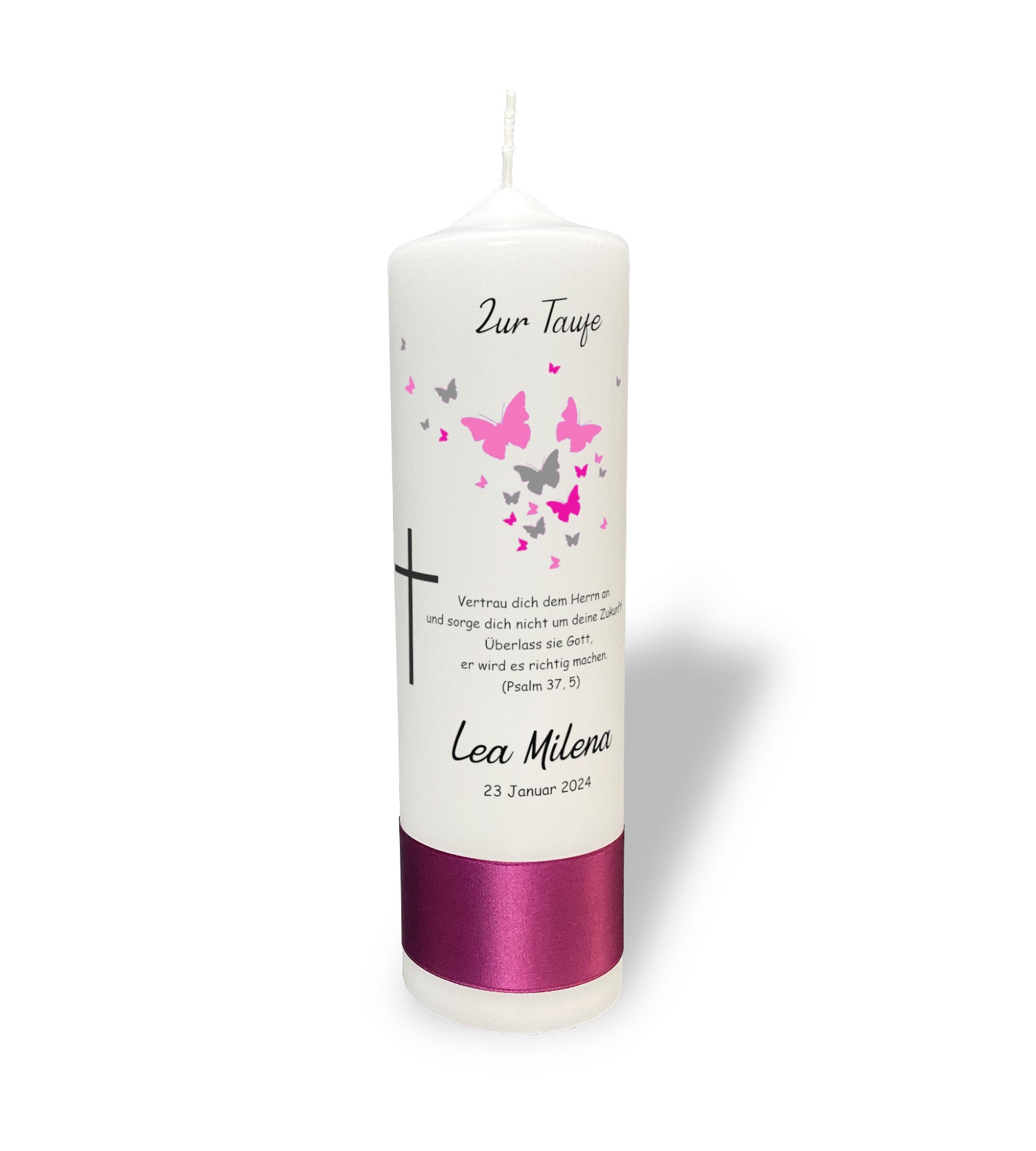 Motiv: Eine Taufe ist ein Moment der Hoffnung und des Glaubens, eingefangen in dieser einzigartigen Taufkerze. Geschmückt mit einem zarten Schwarm rosa und grauer Schmetterlinge, die um ein kräftiges Kreuz tanzen, symbolisiert sie die Verwandlung und den Geist des Neuanfangs. Lassen Sie diese Kerze als Leitstern für den Lebensweg Ihres Kindes leuchten, ein ewiges Symbol für Glaube und Zuversicht.