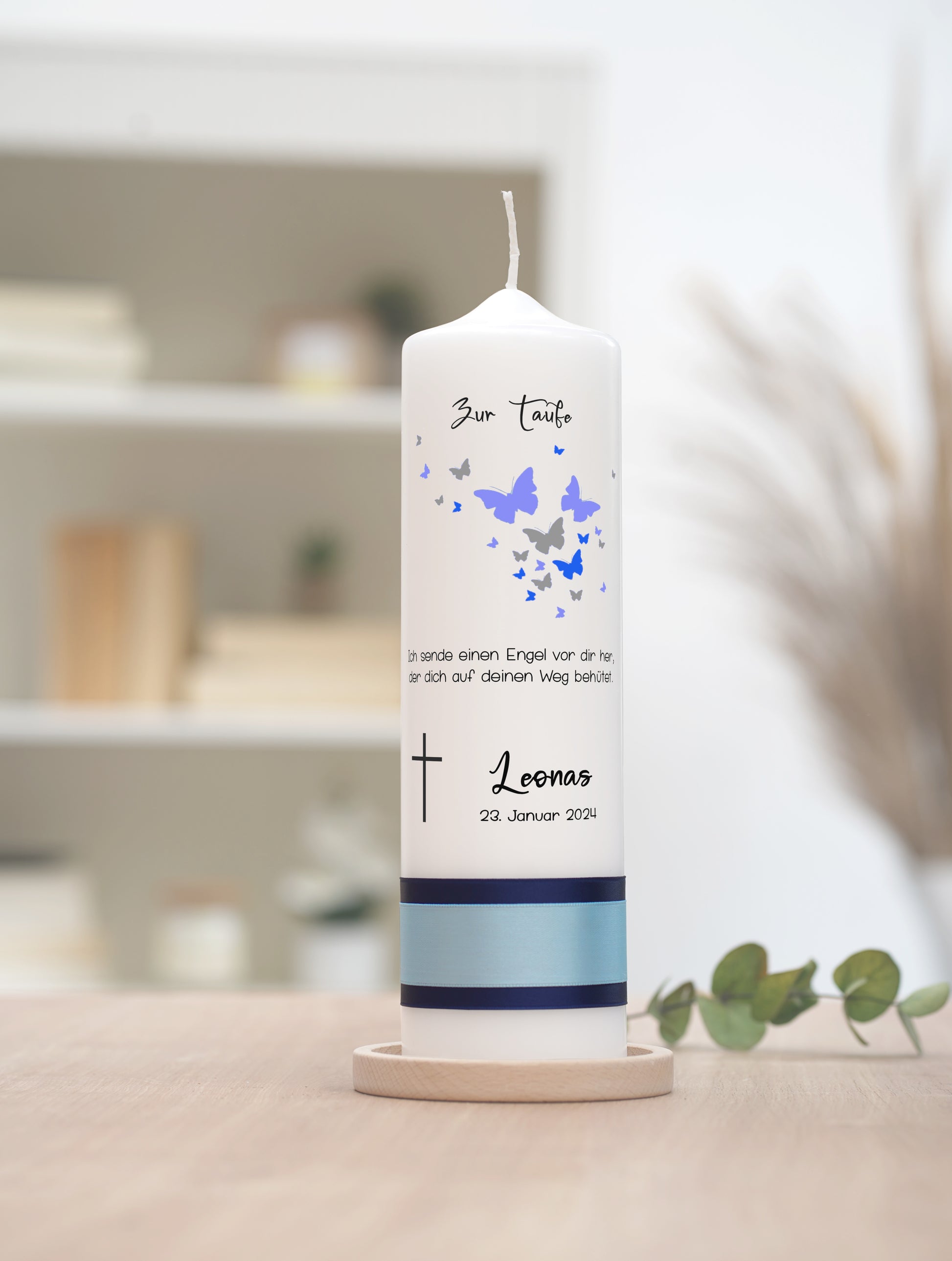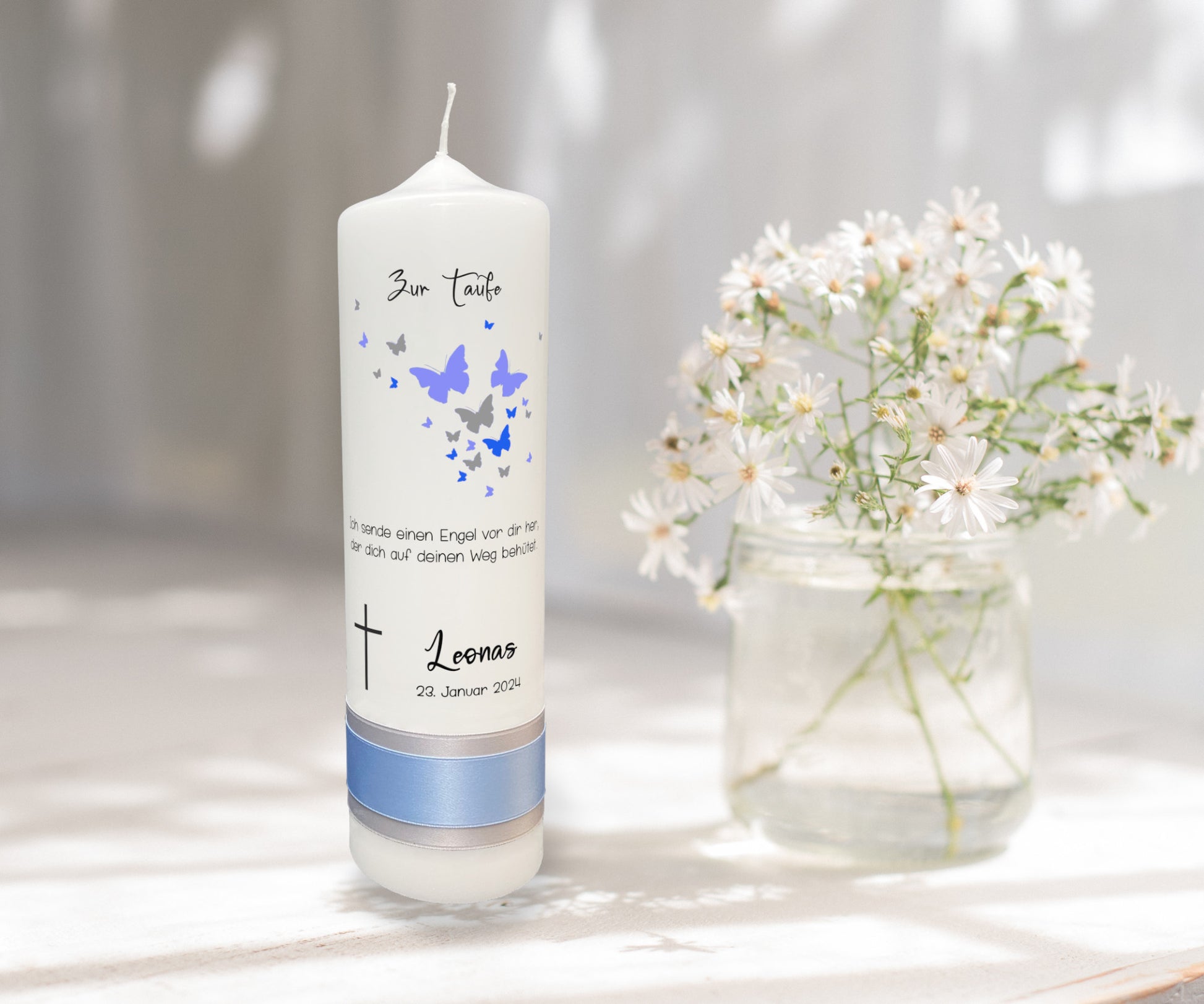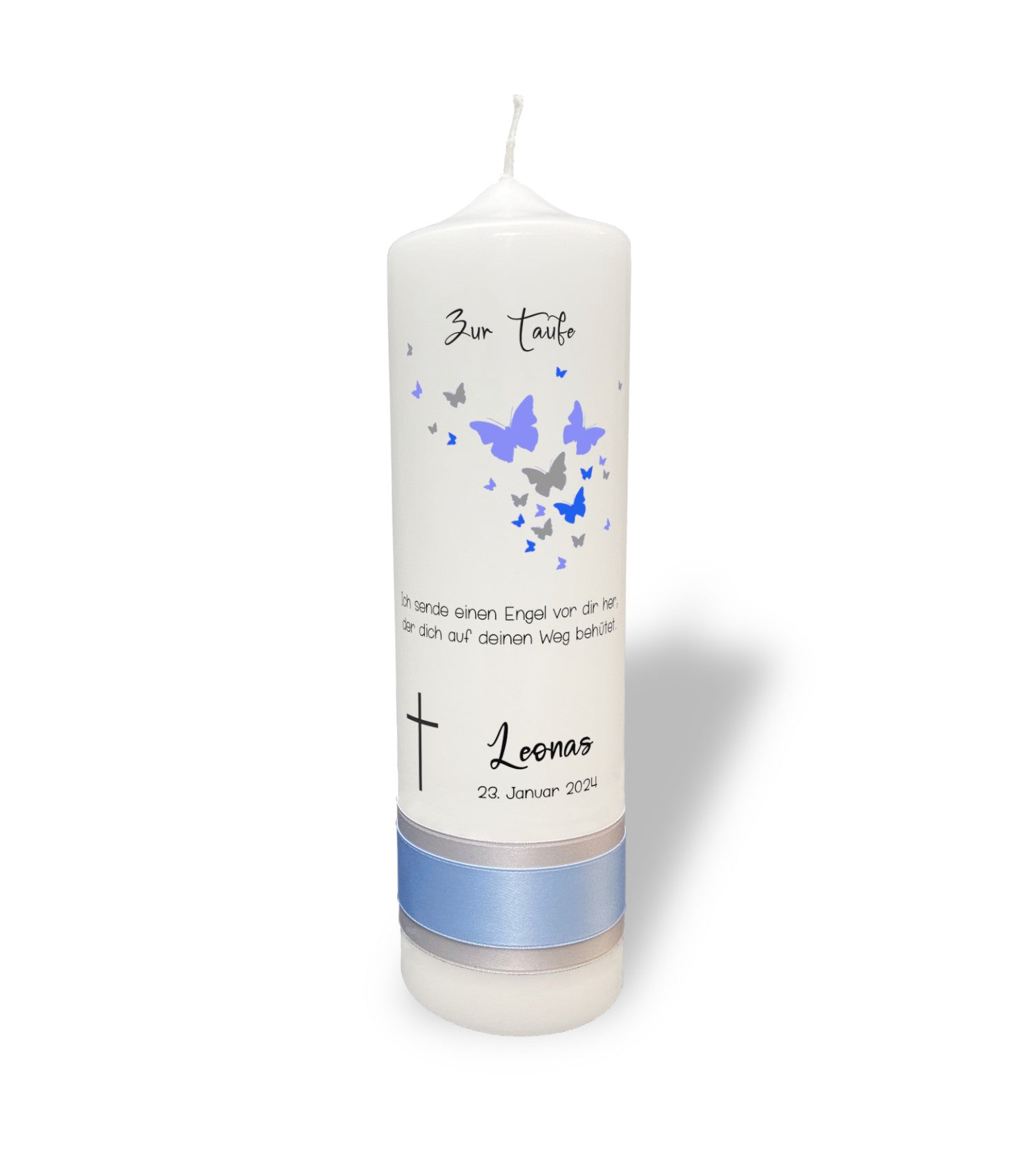 Motiv: Eine Taufe ist ein Moment der Hoffnung und des Glaubens, eingefangen in dieser einzigartigen Taufkerze. Geschmückt mit einem zarten Schwarm rosa und grauer Schmetterlinge, die um ein kräftiges Kreuz tanzen, symbolisiert sie die Verwandlung und den Geist des Neuanfangs. Lassen Sie diese Kerze als Leitstern für den Lebensweg Ihres Kindes leuchten, ein ewiges Symbol für Glaube und Zuversicht.