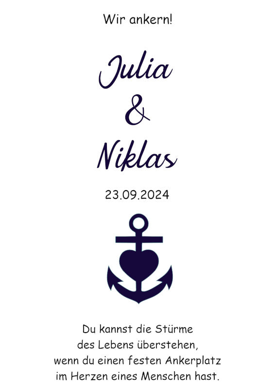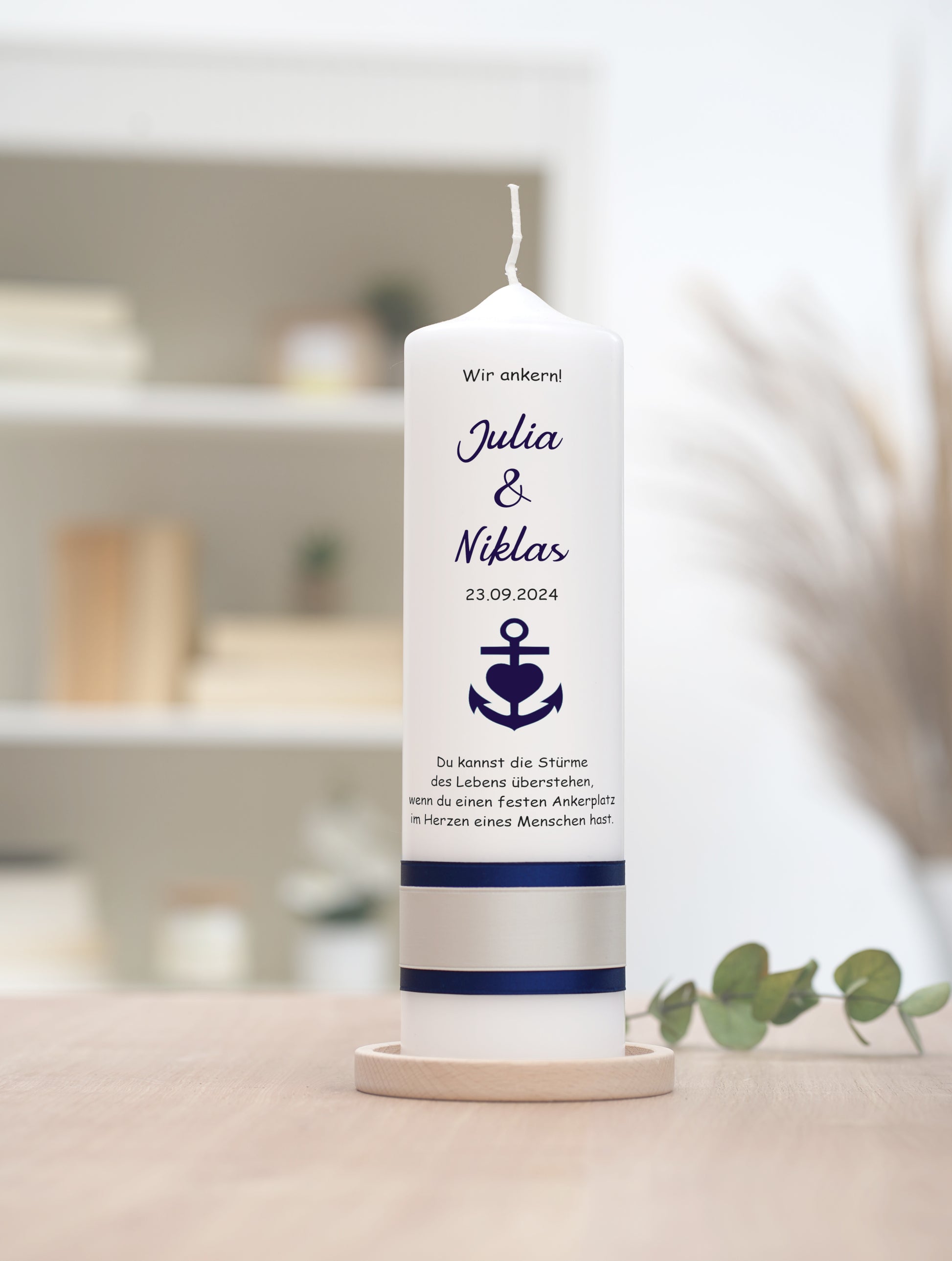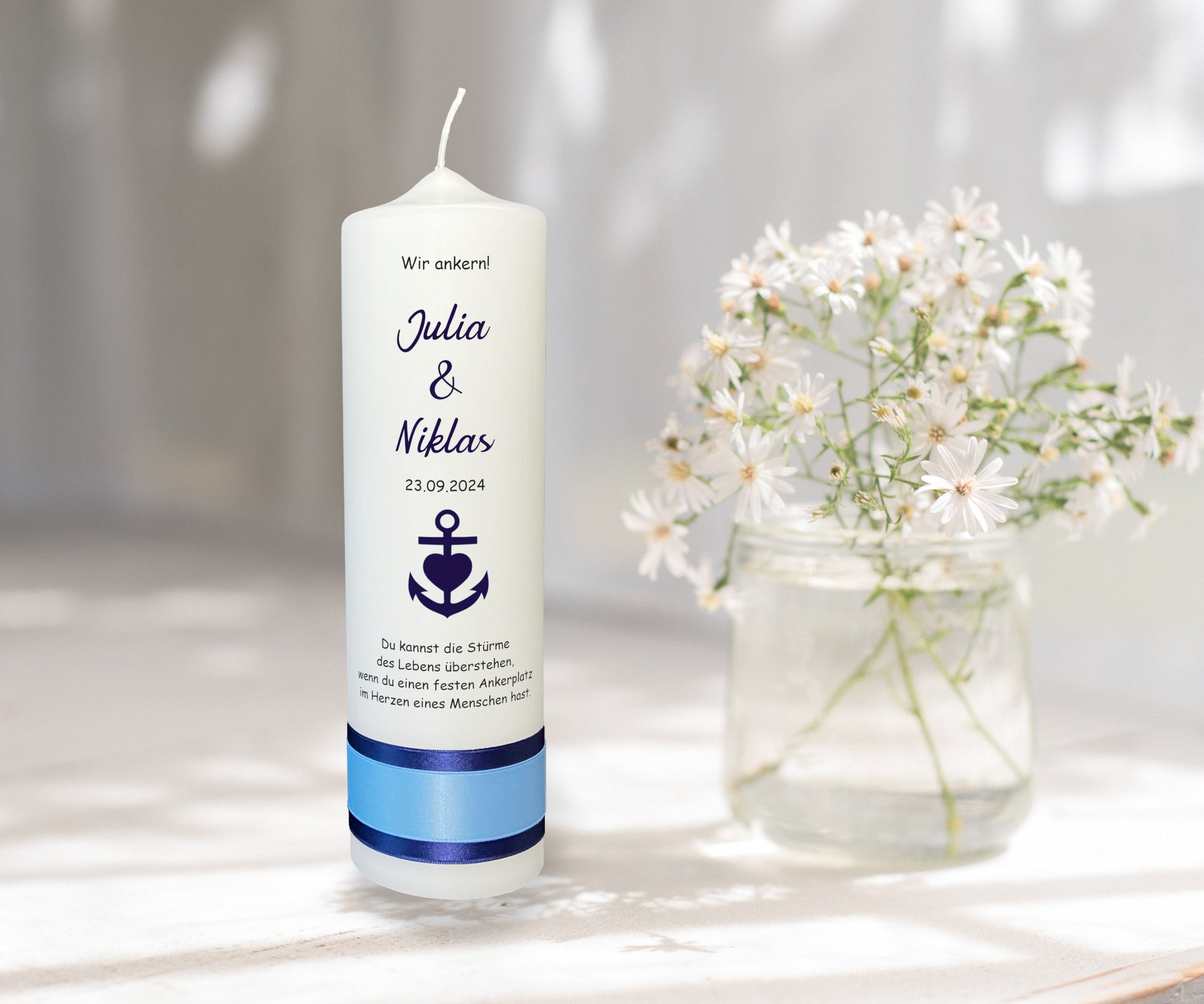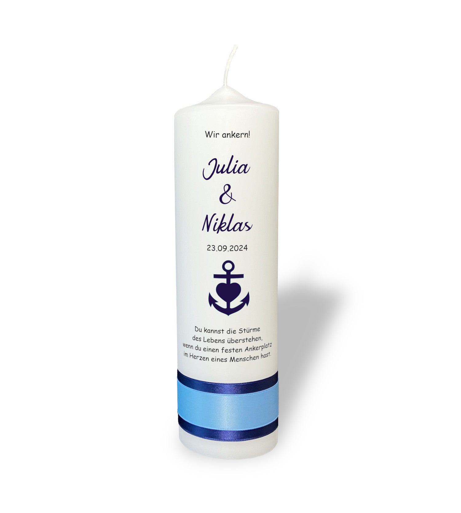 Motiv: Entdecken Sie das perfekte Symbol Ihrer unerschütterlichen Verbundenheit. Unsere handgefertigte Kerze ziert ein edler blauer Anker, der Stärke und Hoffnung verkörpert – ein Sinnbild für die sichere Hafen in der Ehe. Lassen Sie dieses Meisterwerk zum leuchtenden Mittelpunkt Ihrer Zeremonie werden und erleben Sie, wie es Ihre Liebe mit jedem Funken weiter entfacht. Ein unvergessliches Geschenk, das die Essenz Ihres gemeinsamen Lebensweges einfängt.