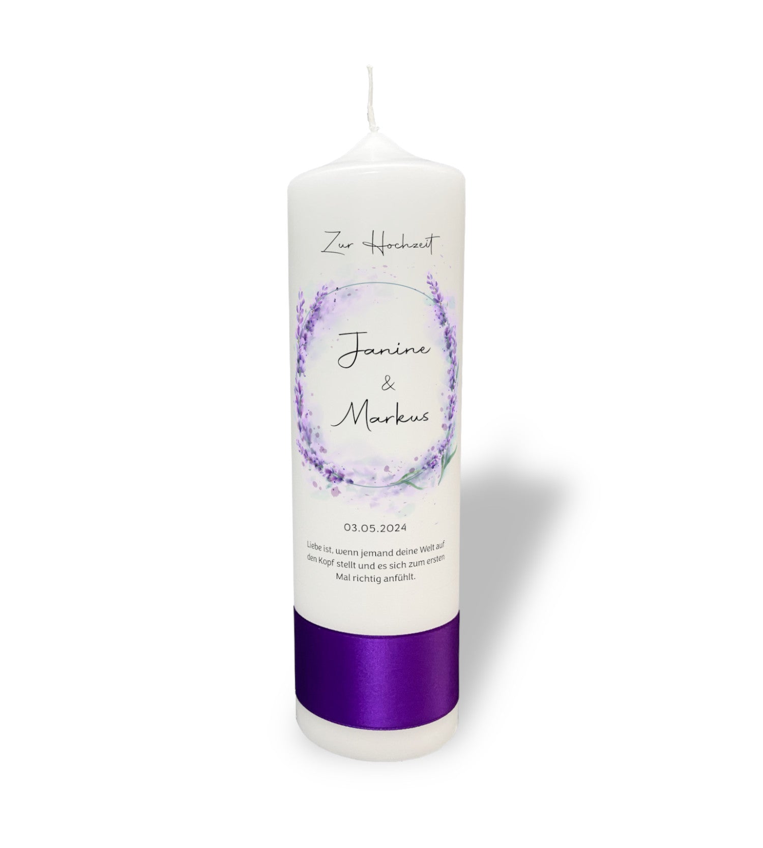 Entzünden Sie das Licht Ihrer Liebe, die die Welt auf den Kopf stellt und sich doch so richtig anfühlt, mit dieser zauberhaften Hochzeitskerze. Der elegante Lavendelkranz symbolisiert die Schönheit und den beruhigenden Duft Ihrer einzigartigen Verbindung. Diese Kerze ist ein wundervolles Symbol für den besonderen Menschen, der Ihr Leben vollkommen macht und mit dem sich alles zum ersten Mal richtig anfühlt.