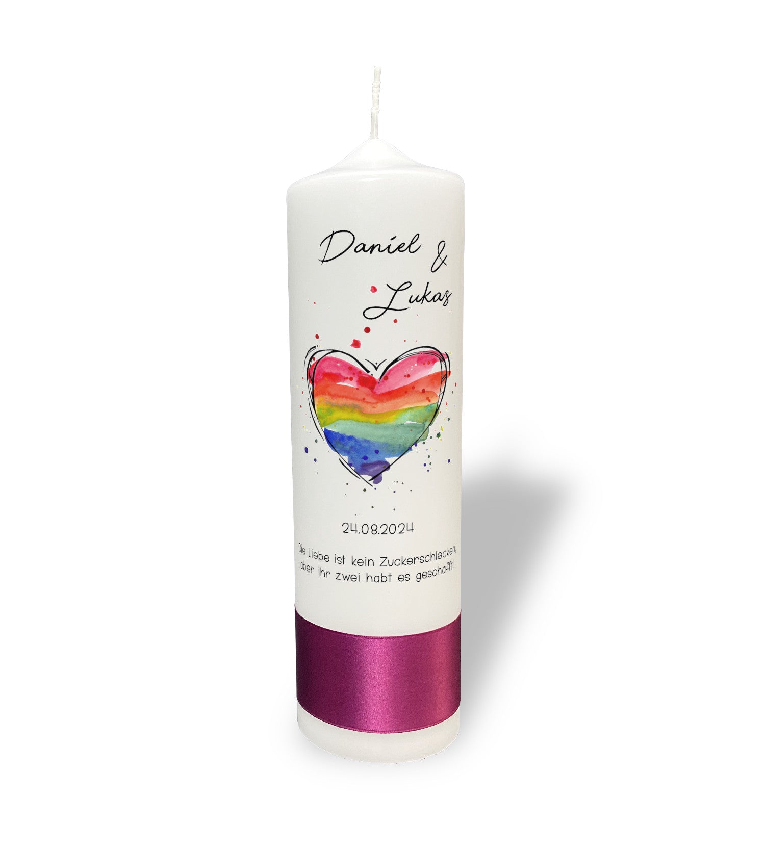 Entzündet eure gemeinsame Zukunft mit unserer besonderen Hochzeitskerze. Das farbenfrohe Herz ist ein fröhliches Zeichen eurer Verbundenheit und macht diese Kerze zu einem schönen Erinnerungsstück an euren besonderen Tag.