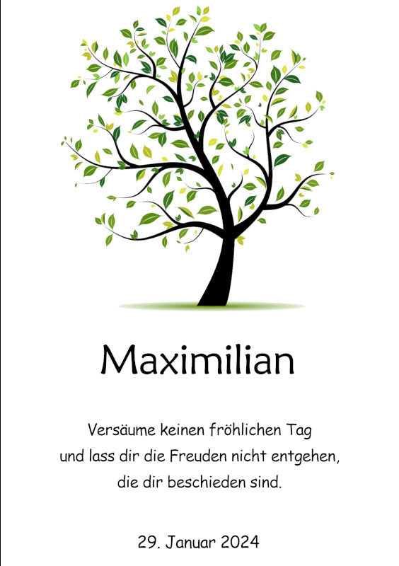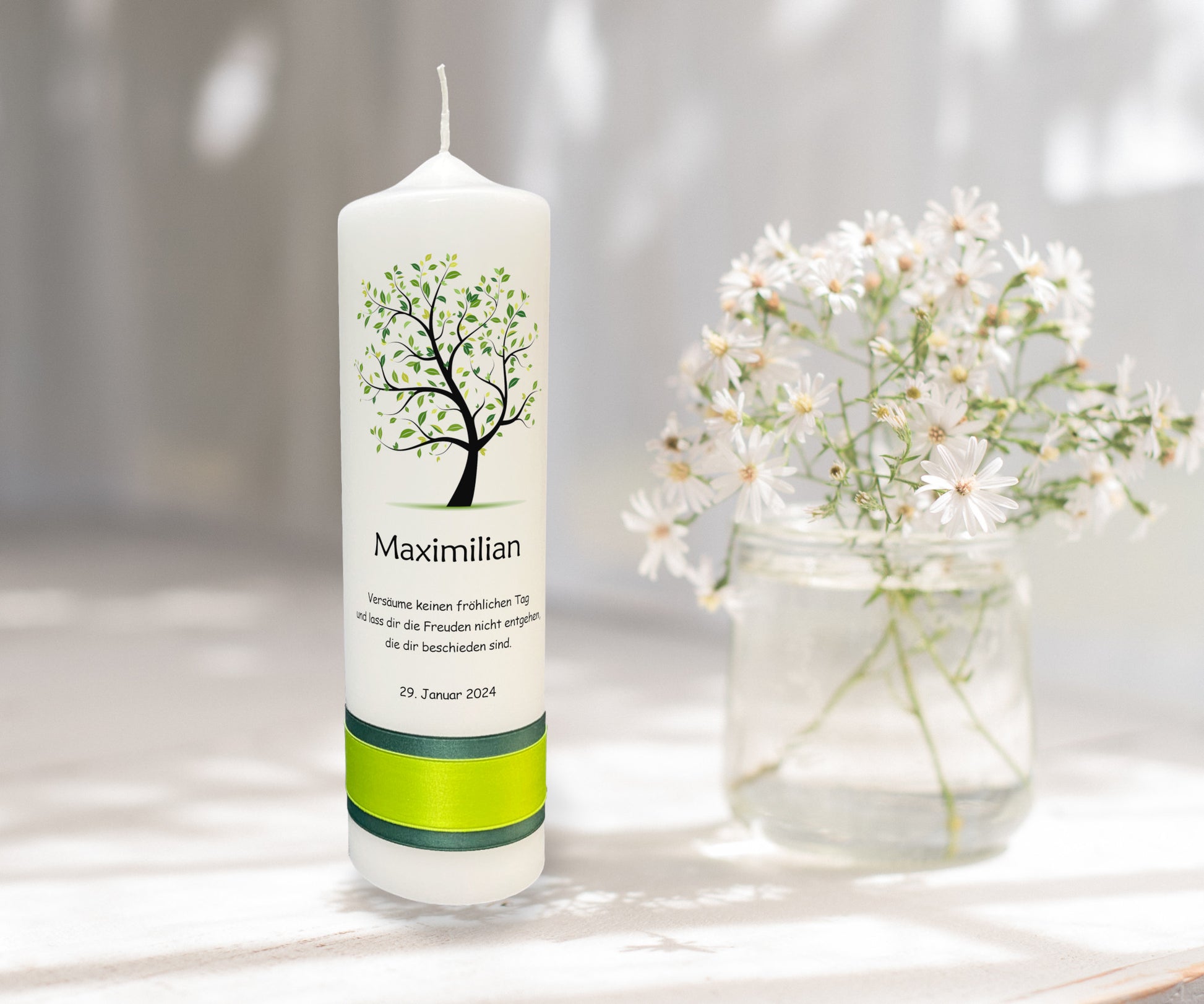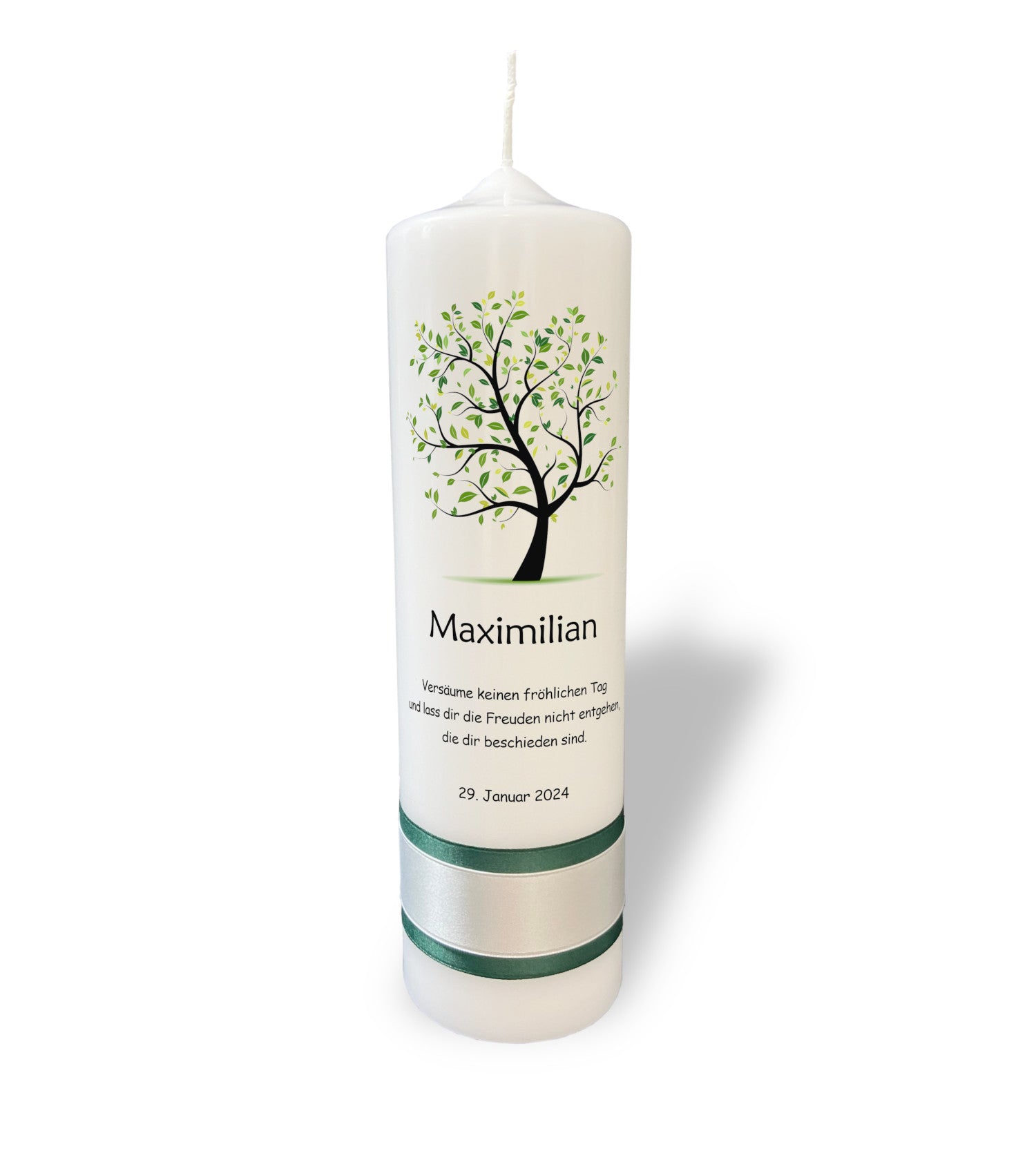 Motiv: Diese Taufkerze, geschmückt mit einem prächtigen Baum voll grüner Blätter, ist ein Symbol des Wachstums und des Lebens. Sie erinnert daran, jeden Tag Freude zu finden und die kleinen Glücksmomente zu schätzen, wie es der zugehörige Spruch empfiehlt. Ein lebendiges Zeichen für die Entwicklung und die natürlichen Freuden des Lebens, das Ihrem Kind von Anfang an mit auf den Weg gegeben wird.