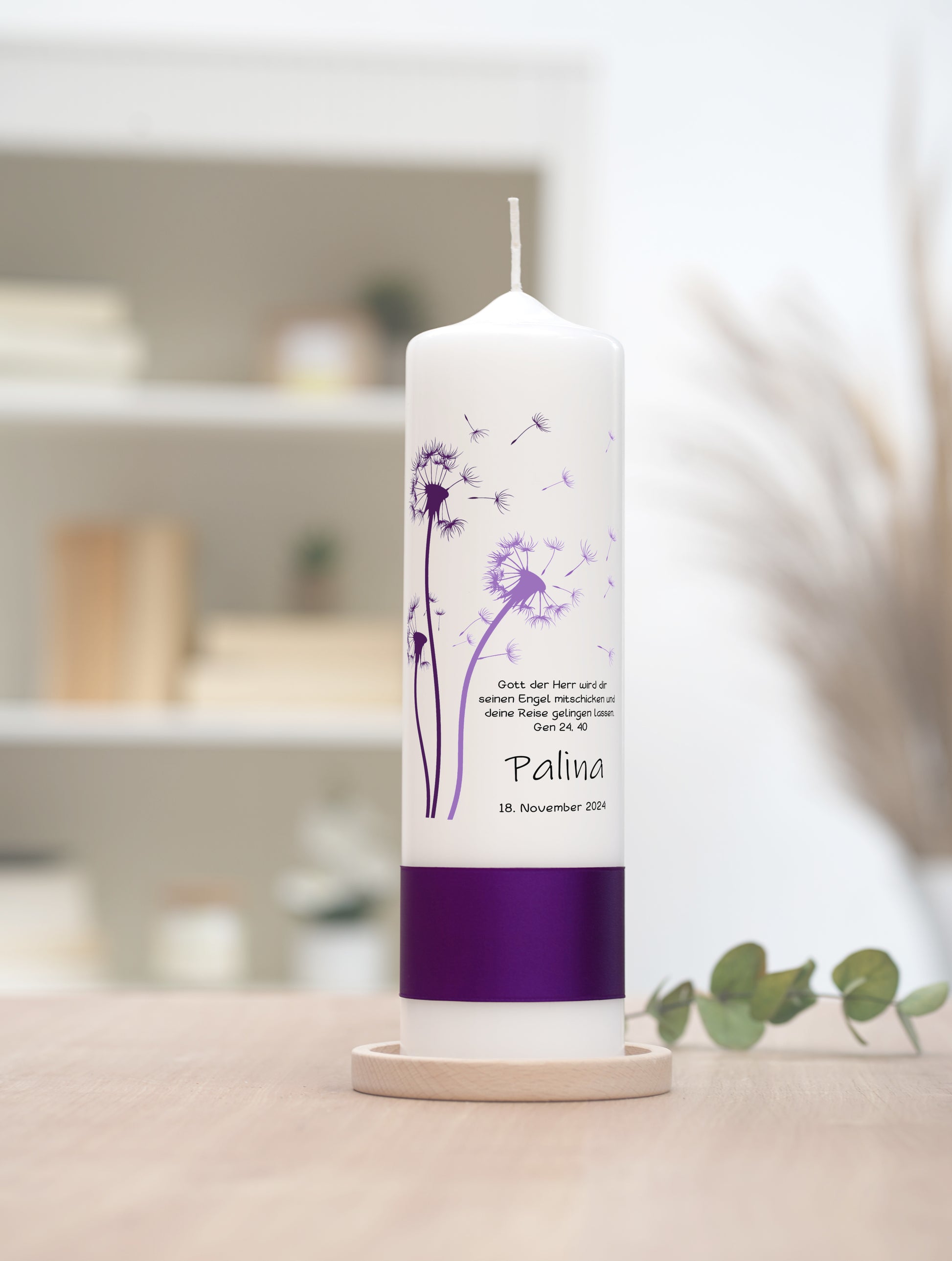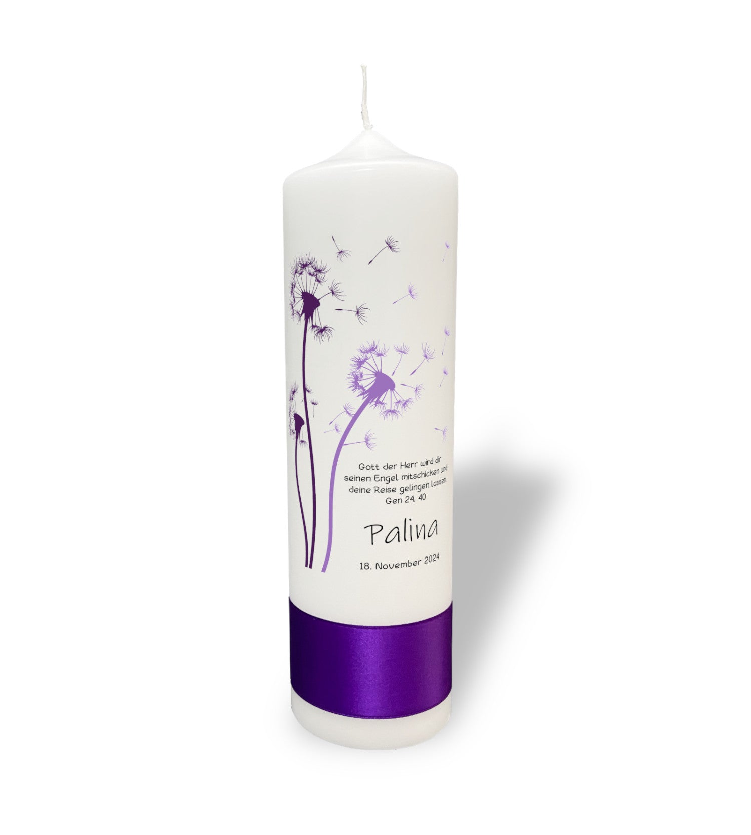 Motiv: Diese bezaubernde Taufkerze, verziert mit lila Pusteblumen, die sanft im Wind zu tanzen scheinen, ist ein Symbol für Hoffnung und die göttliche Führung auf dem Lebensweg Ihres Kindes. Der Bibelvers aus Genesis 24,40 verspricht göttlichen Beistand und eine gesegnete Reise. Diese Kerze ist ein leuchtendes Symbol des Glaubens und der Freiheit, das Hoffnung und Segen in jedem Moment des Lebens verbreitet.
